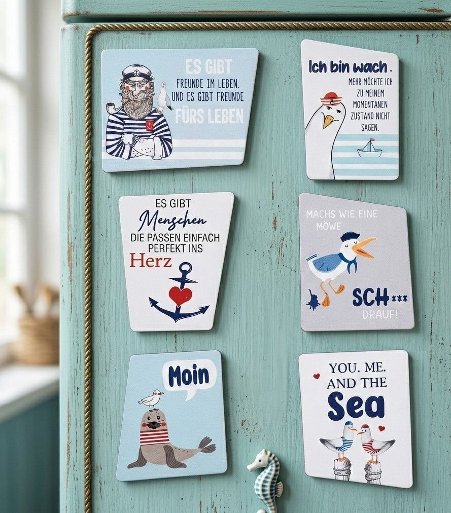 • Möwe, Seehund, Anker Herz, Kapitän, Moin, Maritim Illustration, Blau Weiß Rot, Nautisches Design, You Me and the Sea, Lustige Seevögel, Strandhaus Deko, Meerweh Geschenk, Typografie Magnete