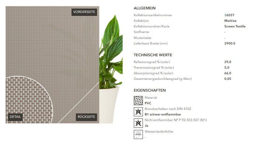 Markisenstoff Screen Textile Hersteller: Kadeco Breite 290 cm Preis pro lfm ------------------------ wir liefern Markisenstoff versandkostenfrei ------------------------- bitte teilen Sie uns vor oder nach dem Kauf mit: - die genaue Lieferadresse - eine Telefonnummer und falls möglich zusätzlich ein