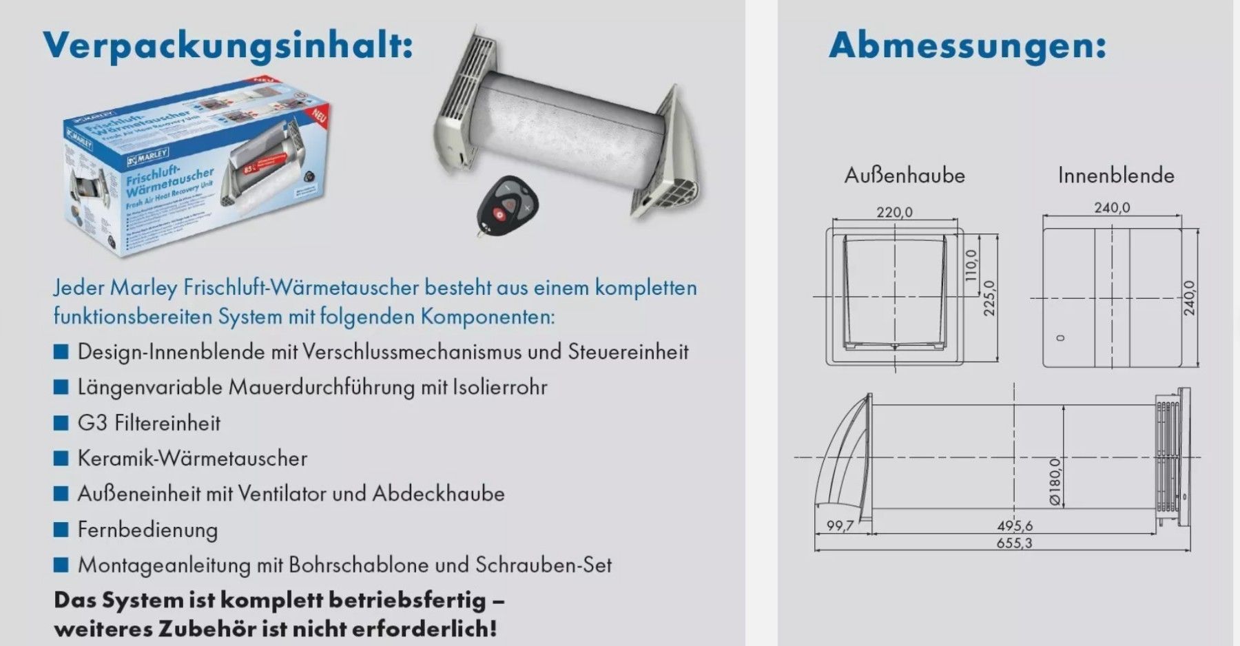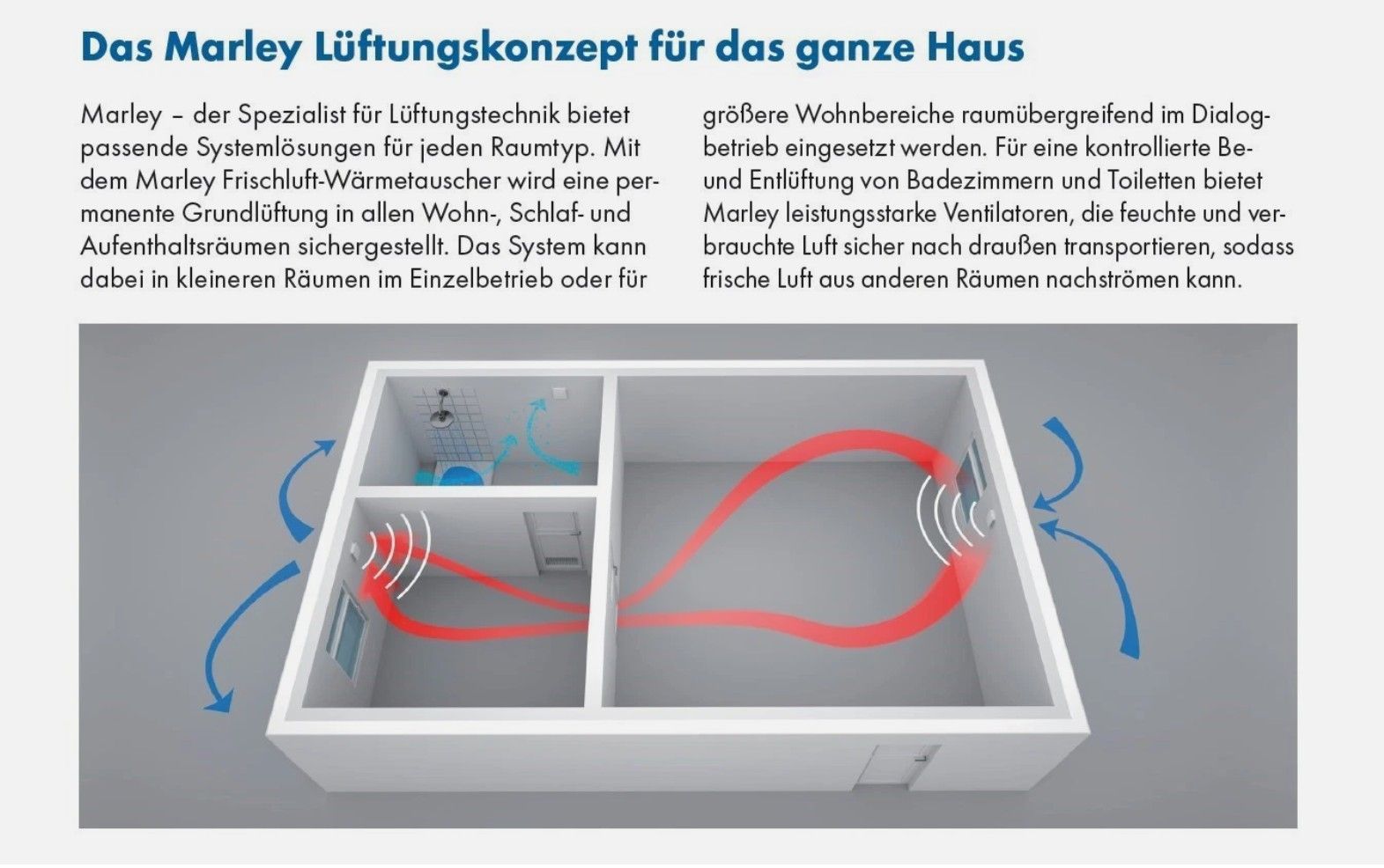 Der Frischluft-Wärmetauscher von Marley ist ein dezentrales Lüftungsgerät mit Wärmerückgewinnung, ideal geeignet für den Einsatz in wärmegedämmten Häusern, Wohnungen und anderen Gebäuden. Durch die einfache Montage und eine intelligente Steuerung über eine komfortable Funkfernbedienung ist dieses Lü