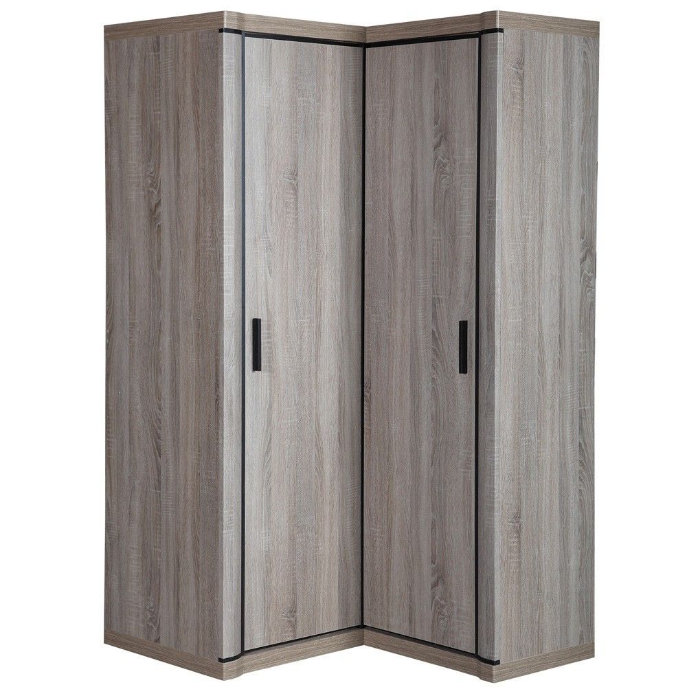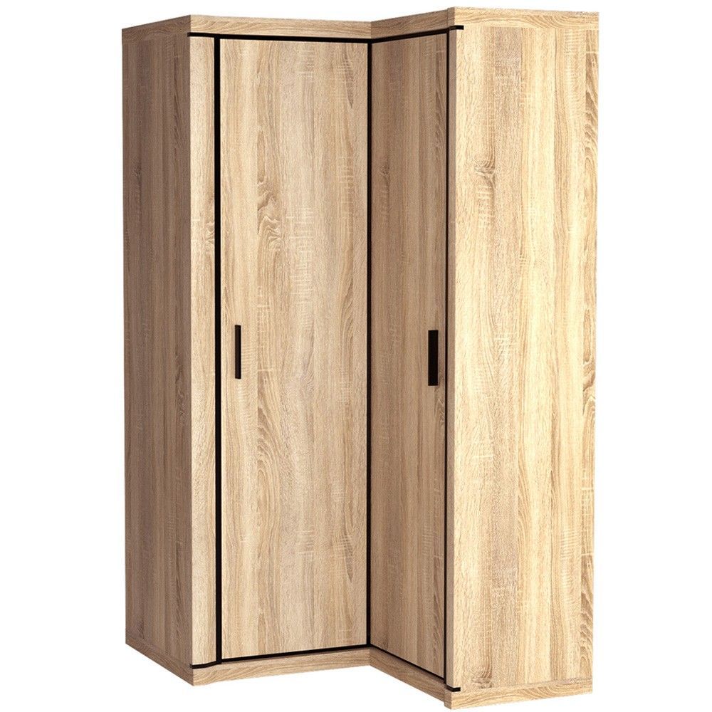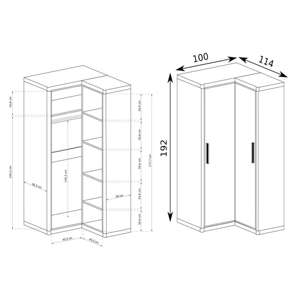 Marmex Dallas D21 - Eckgarderobe; mit Regalen und einer Bar; Flügeltür nach innen; ein nicht universelles Möbelstück (Maße und Einstellung wie auf den Fotos); moderner Kleiderschrank für das Wohn- oder Schlafzimmer Farbe: Trüffel Eiche Sonoma Eiche Maße: Breite: 100-114 cm Höhe: 192 cm Tiefe: 58- 43