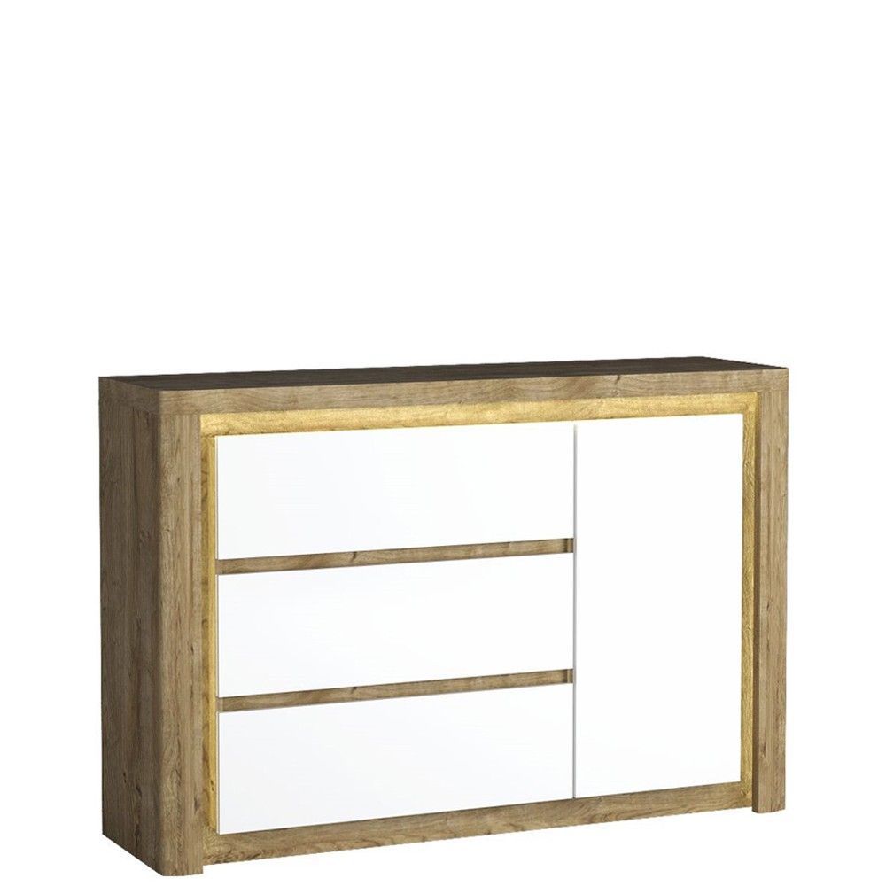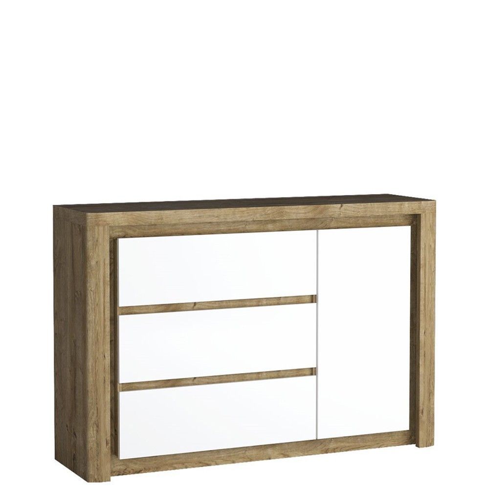 Marmex Livinio 15 - Eine elegante, zeitlose Kommode. Dank drei geräumiger Schubladen und einem Schrank wird es sehr funktional; Die Möbel verwenden die hochwertigsten Scharniere mit Soft-Close. Kommode zum Schlafzimmer, Zimmer und Wohnzimmer. Es wird das Interieur aufhellen und ihm ein modernes Auss