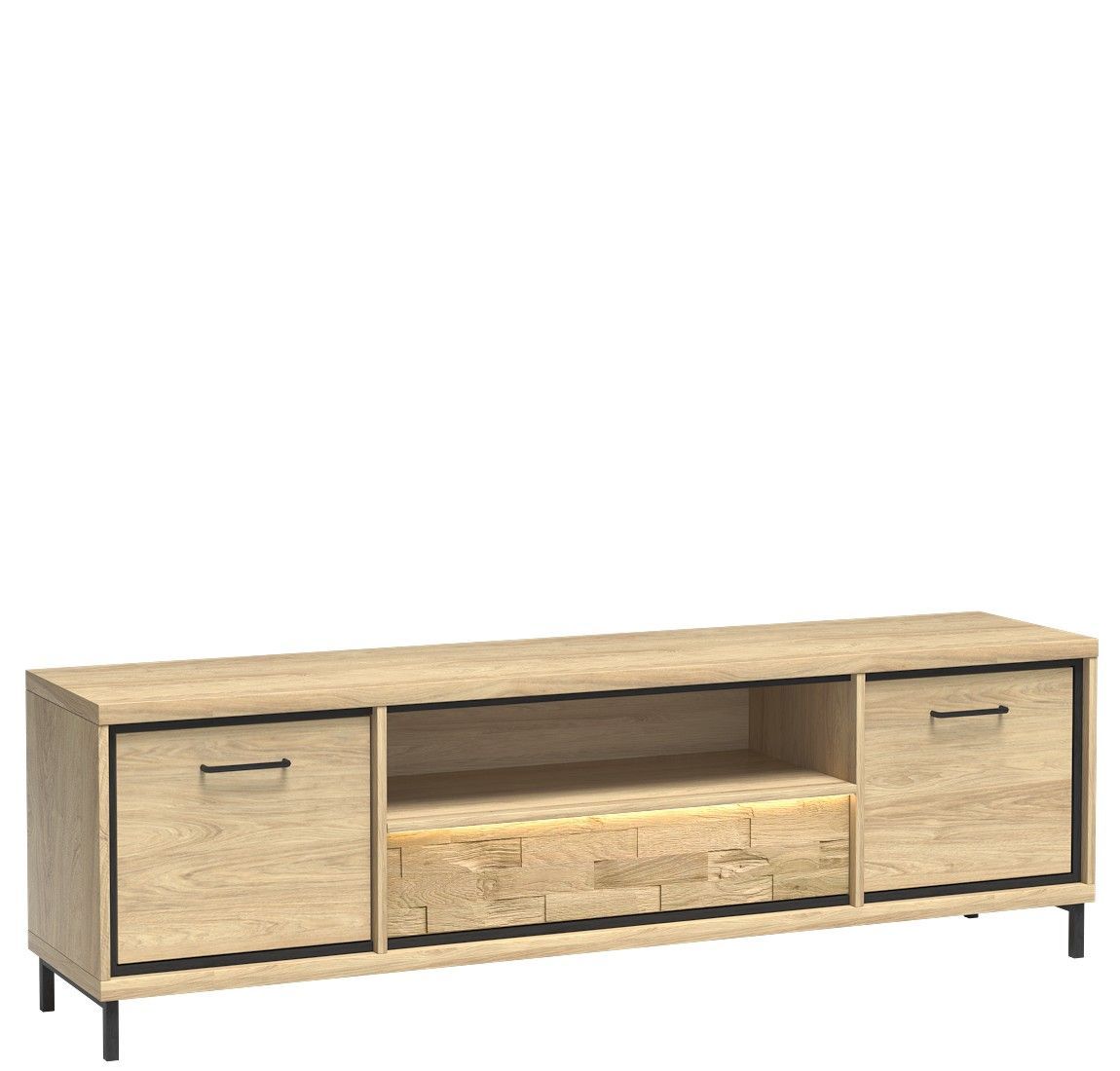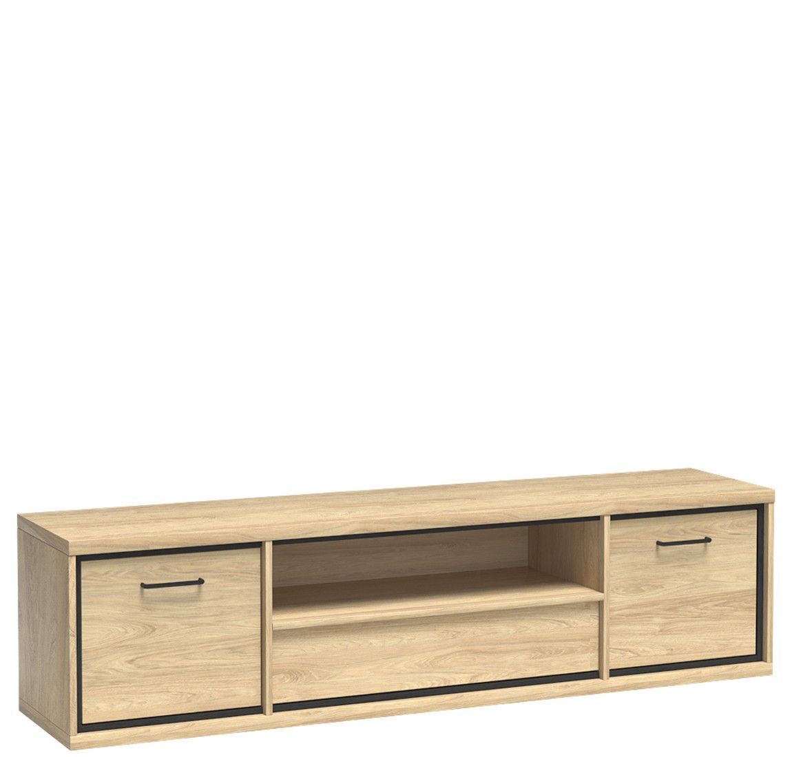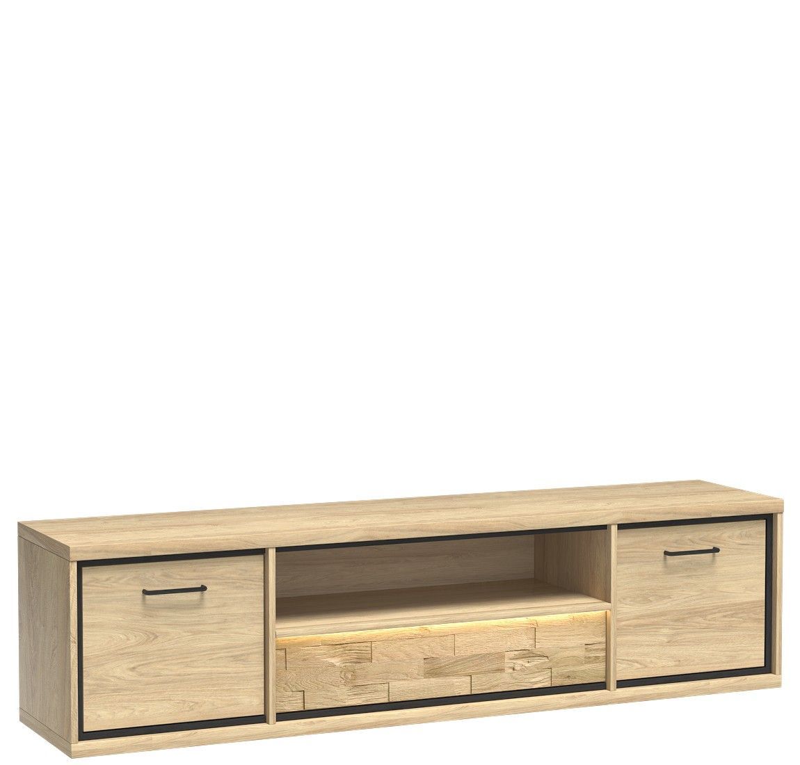 Marmex Mediolan M-13 - Ein großer Fernsehschrank, 181 cm breit; In den Seitenschränken befinden sich Einlegeböden; es hat auch eine Schublade, die durch Berührung geöffnet werden kann; Ein sehr heller, gemütlicher Holzton. Durch die Kombination mit dunklen Accessoires erhalten wir einen industrielle