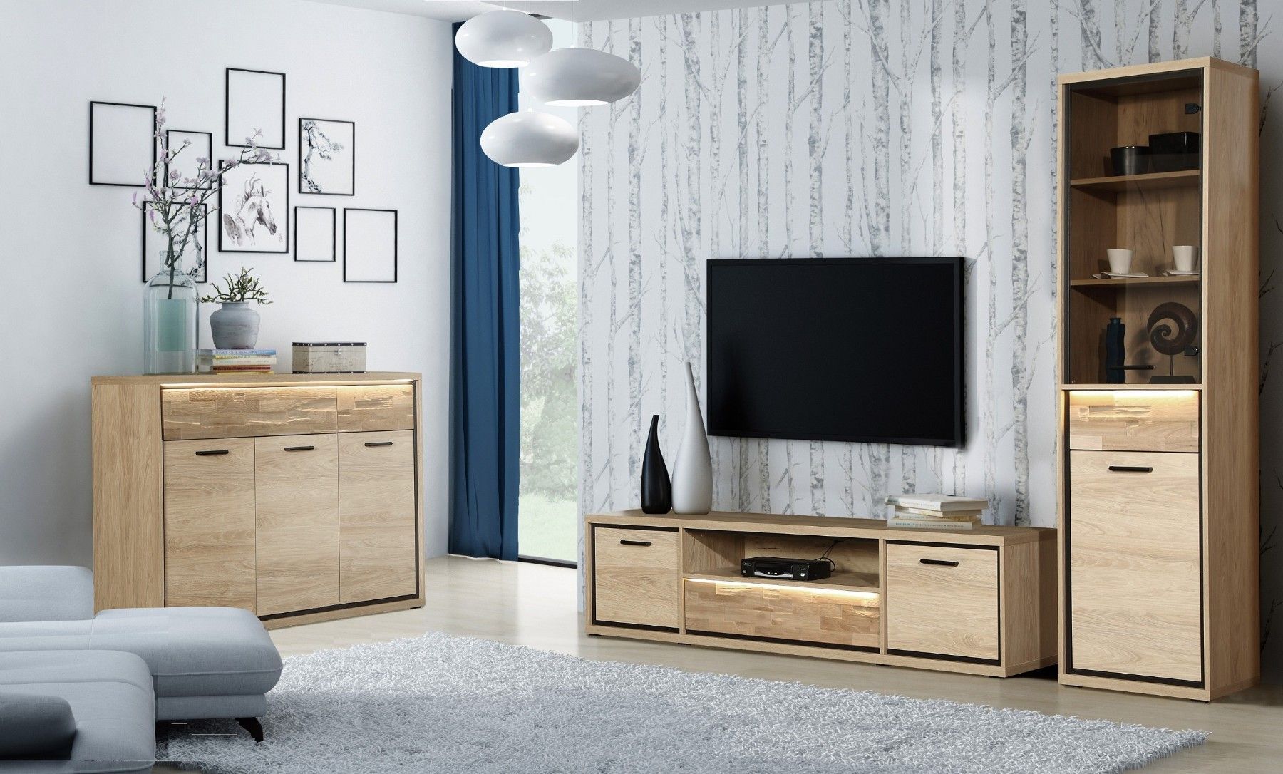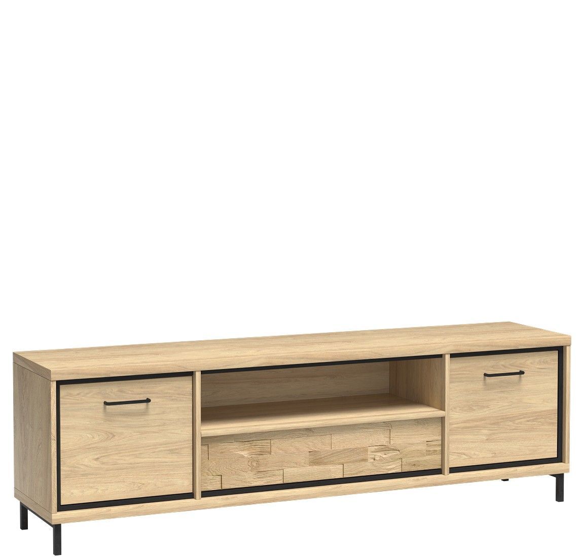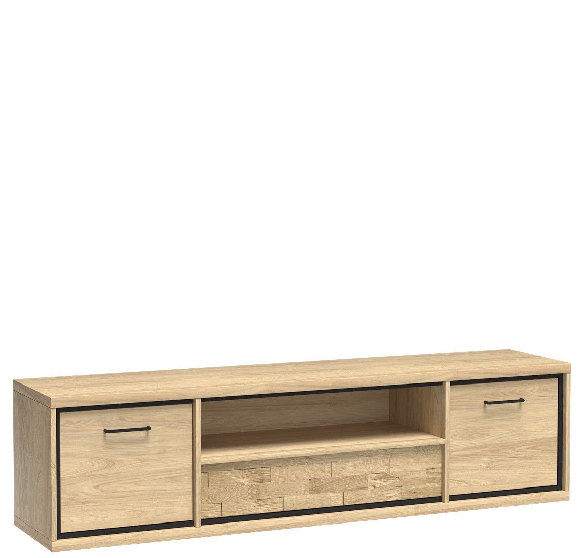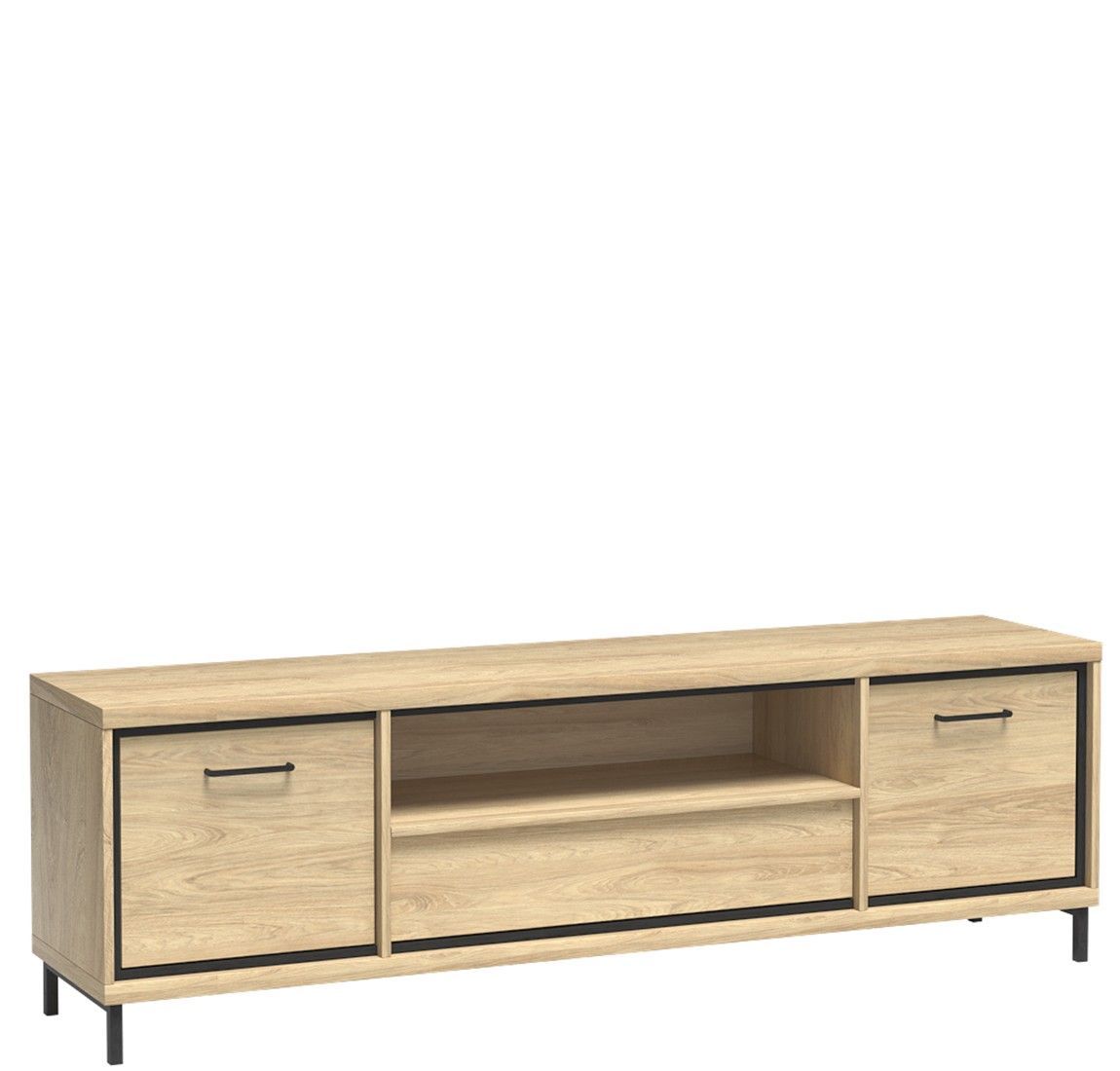 Marmex Mediolan M-13 - Ein großer Fernsehschrank, 181 cm breit; In den Seitenschränken befinden sich Einlegeböden; es hat auch eine Schublade, die durch Berührung geöffnet werden kann; Ein sehr heller, gemütlicher Holzton. Durch die Kombination mit dunklen Accessoires erhalten wir einen industrielle