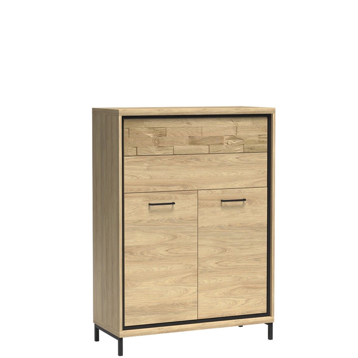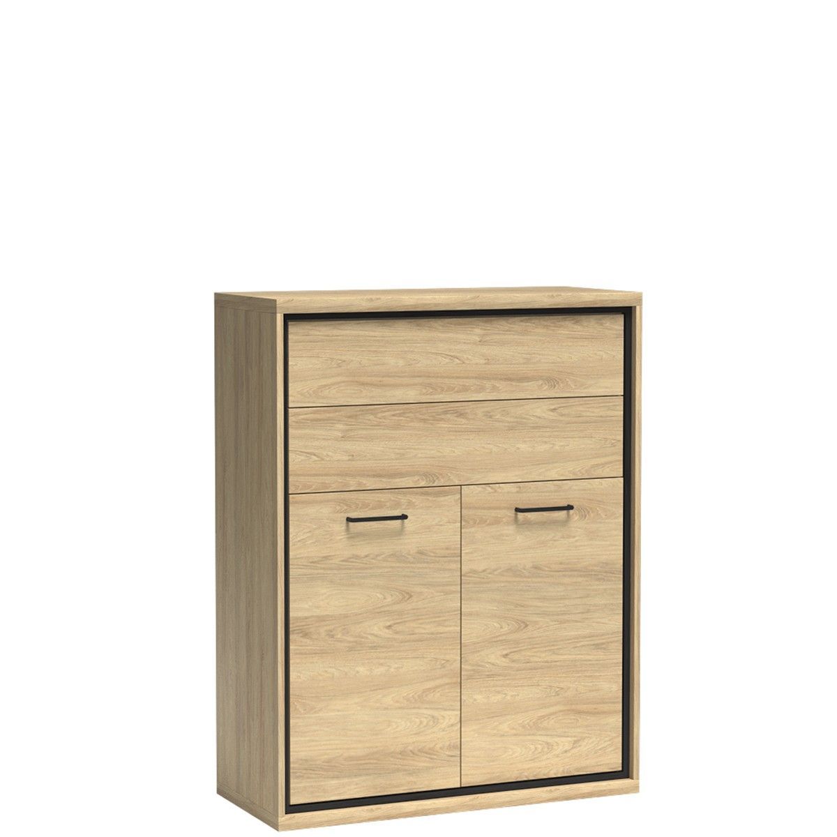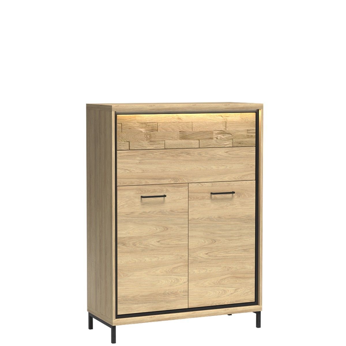 Marmex Mediolan M-6 - Eine kleine, funktionale Kommode in hellem Hickory-Farbton; Der obere Teil besteht aus zwei Touch-Open-Schubladen; Es passt in das Wohnzimmer, Schlafzimmer oder Esszimmer im industriellen Stil Farbe: natural hikora natural hikora + Eichenbrett Maße: Breite: 92.2 cm Höhe: 120 cm