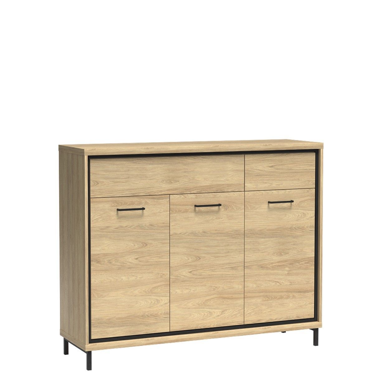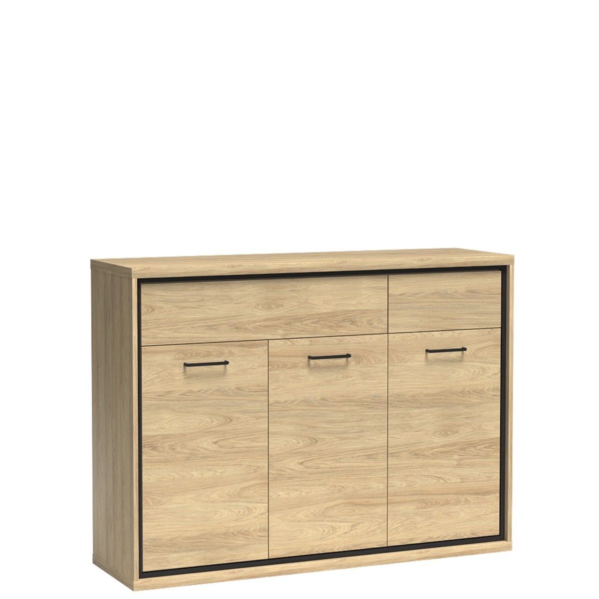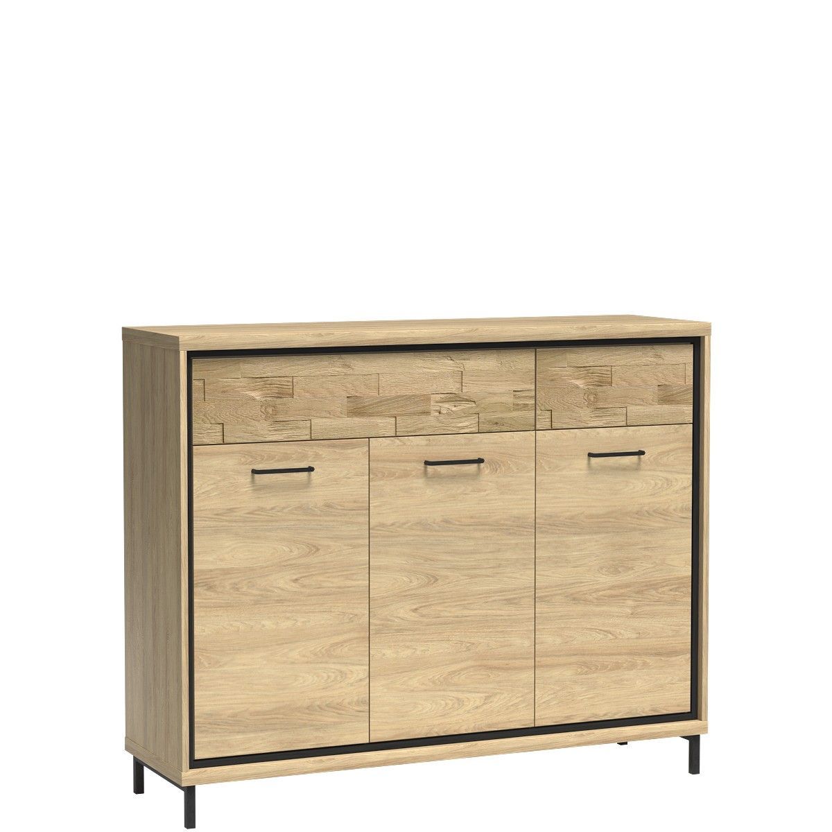 Marmex Mediolan M-6 - Eine große, helle Kommode in Hickory-Naturfarbe; Es besteht aus zwei Schubladen, eine größer und die andere kleiner auf der rechten Seite; Unter den Schubladen haben wir einen Stauraum in Form eines Kleiderschranks mit Doppel- und Einzeltüren; Schwarze Accessoires passen zum De