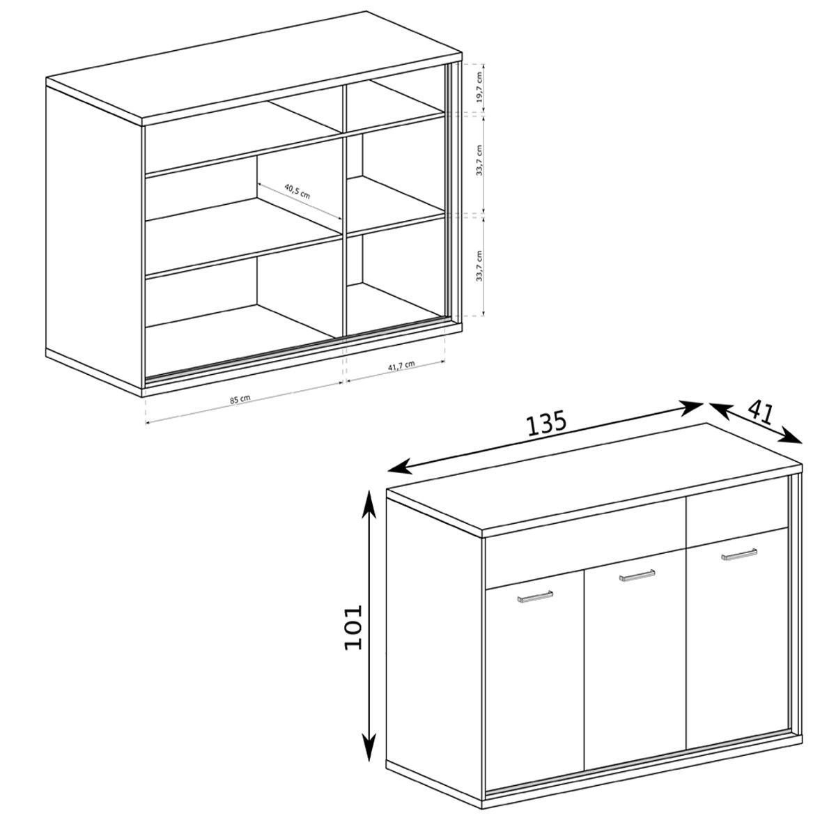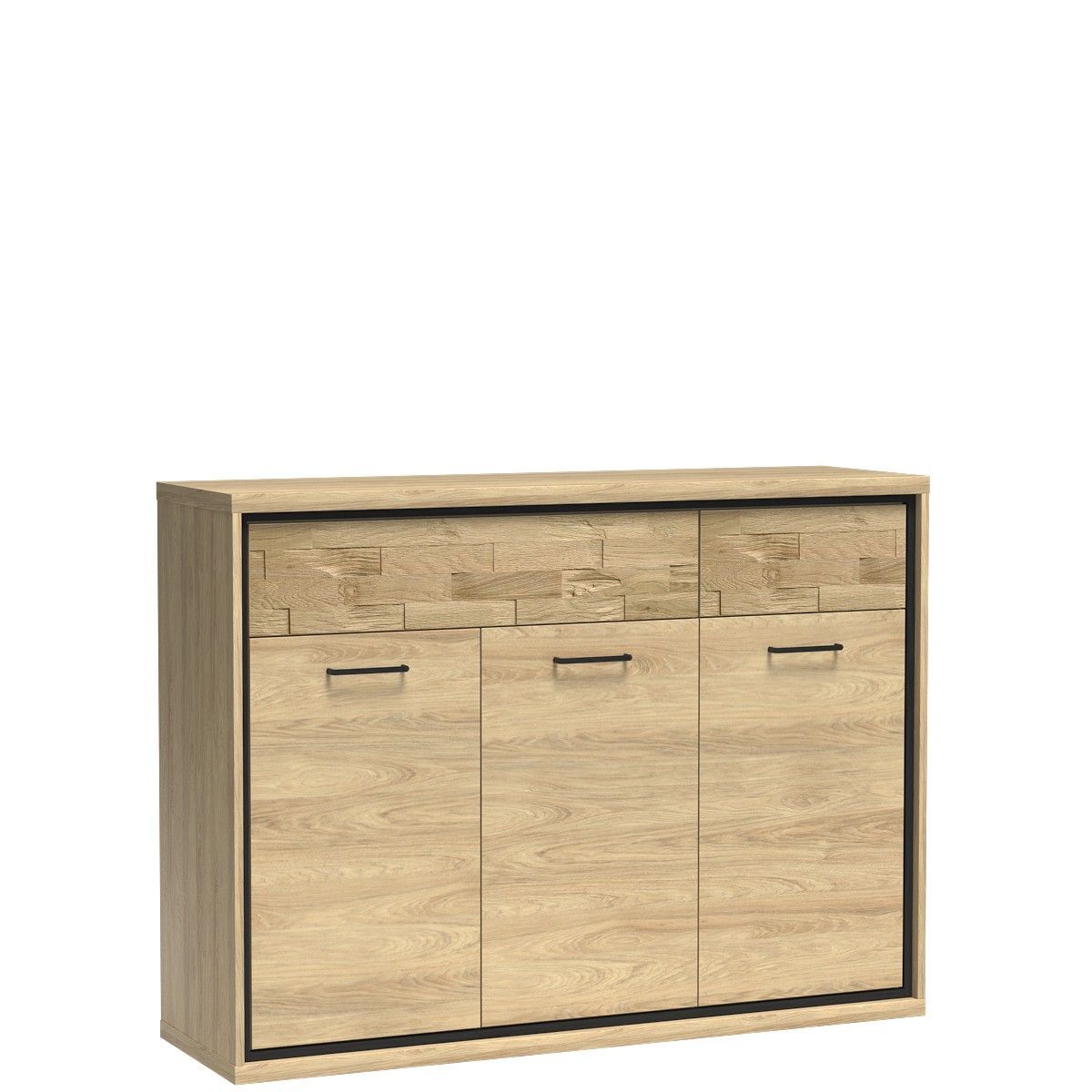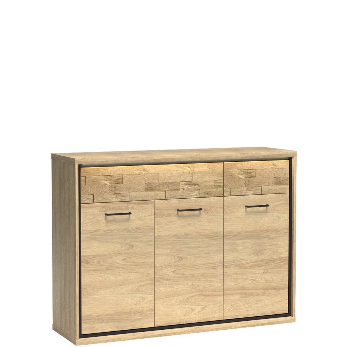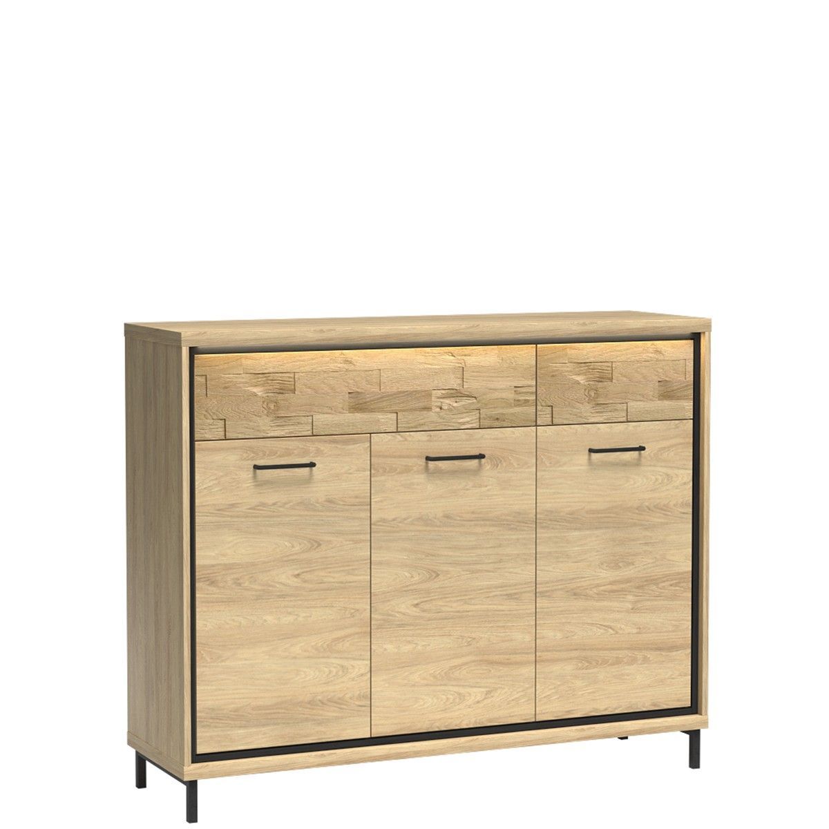 Marmex Mediolan M-6 - Eine große, helle Kommode in Hickory-Naturfarbe; Es besteht aus zwei Schubladen, eine größer und die andere kleiner auf der rechten Seite; Unter den Schubladen haben wir einen Stauraum in Form eines Kleiderschranks mit Doppel- und Einzeltüren; Schwarze Accessoires passen zum De