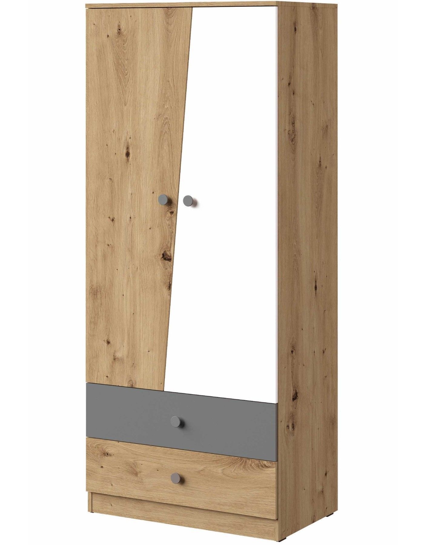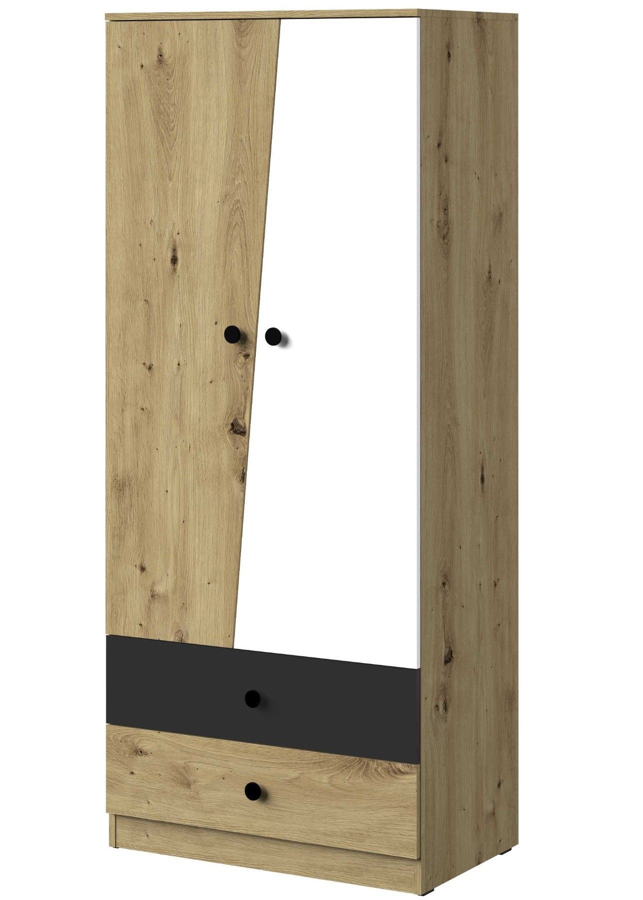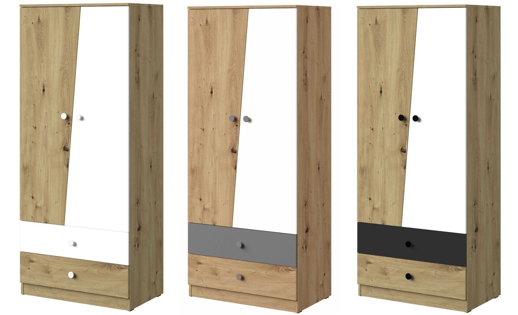 Nero N1 - Zweitüriger Kleiderschrank mit Schubladen, Kleiderschrank mit Fachböden und Stange, für Jugendzimmer, für Kinderzimmer Farbe: Eiche Artisan + weiße Matte Eiche Artisan + weiße Matte + graue Matte Eiche Artisan + weiße Matte + schwarze Matte Maße: Breite: 80 cm Höhe: 190 cm Tiefe: 50 cm Aus