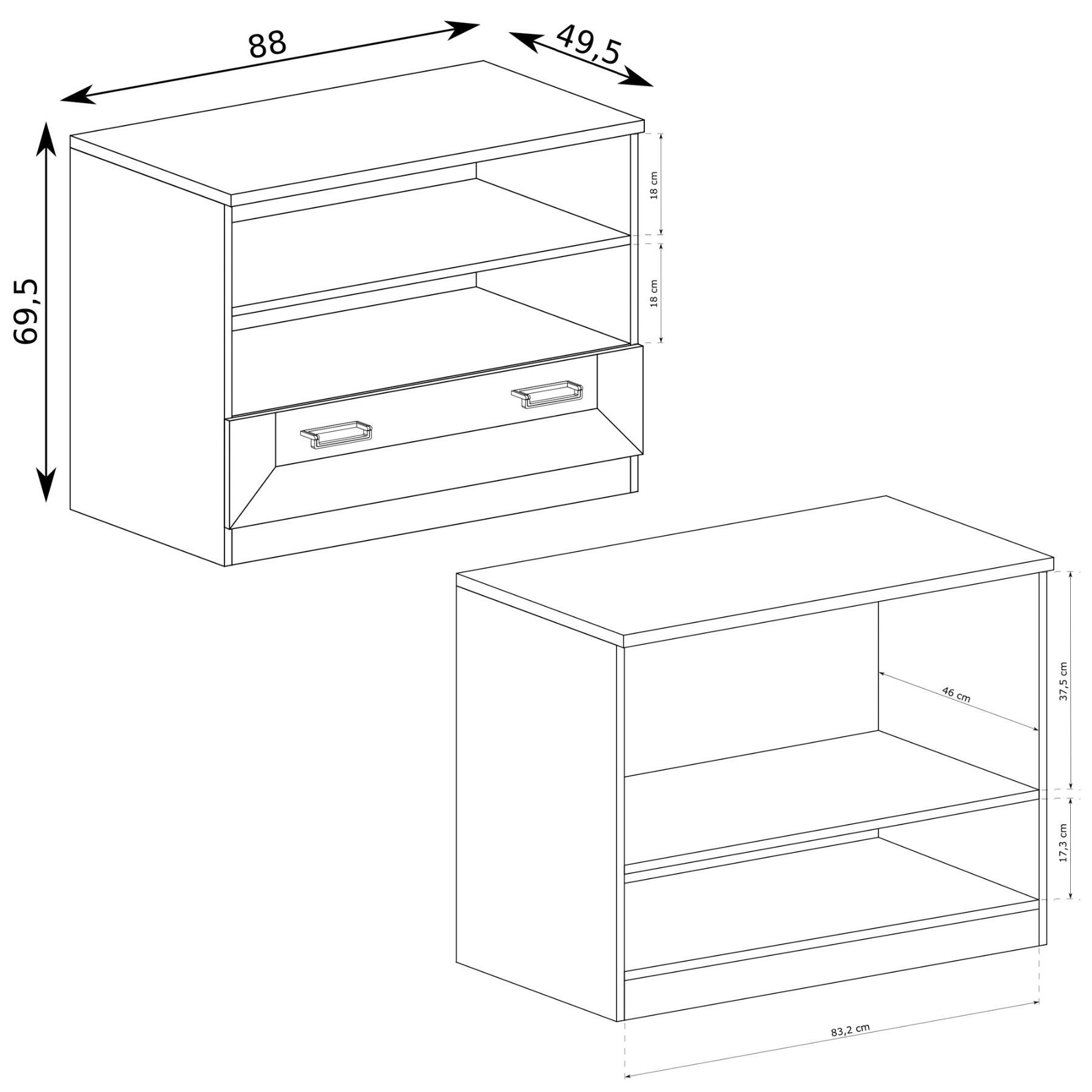 Marmex Tadeusz T24 - Ein kleiner TV-Ständer für ein Fernsehgerät. Es hat eine Schublade und zwei Regale für eine Set-Top-Box oder Konsolen Farbe: 100 Jahre alte Eiche Eiche lefkas Maße: Breite: 88 cm Höhe: 69 cm Tiefe: 50 cm Ausführung: 28 Funktionselemente in einem interessanten Design Ein stilvoll