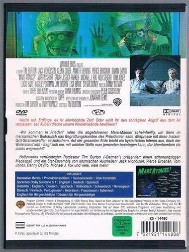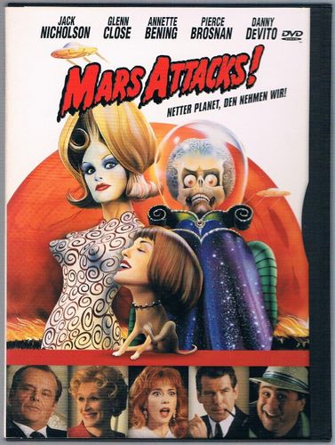 Mars Attacks! - DVD Mit Jack Nicholson, Glenn Close, Annette Bening, Pierce Brosnan, Danny DeVito, Martin Short, Sarah Jessica Parker, Michael J. Fox, Natalie Portman, Rod Steiger, Lukas Haas, Tom Jones u.a. Laufzeit: 102 Minuten Sprachen: Deutsch, Englisch, Spanisch Untertitel: Deutsch, Englisch, S... Mehr