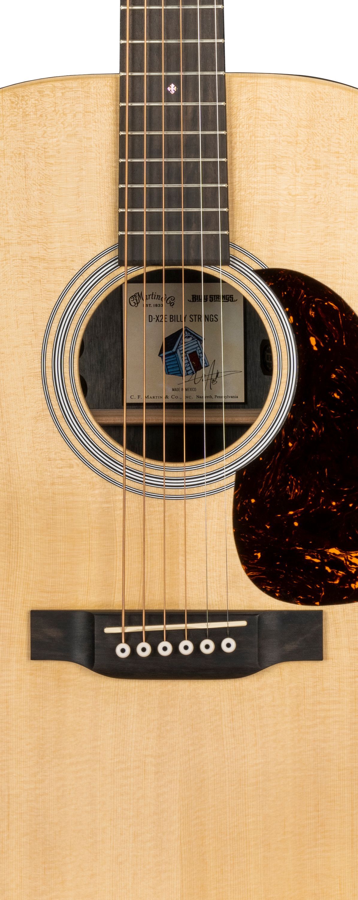 Martin DX-Billy Strings Bauform: Dreadnought Decke: Fichte, massiv Korpus und Zargen: HPL, Palisander-Finish Bracing: Scalloped X Hals: Selektiertes Hartholz Griffbrett: Ebenholz Halsprofil:Modified Low Oval Mensur: 63,5 cm ( 25,0'' ) Sattelbreite: 43,6 mm (1 23 32'' ) Griffbrettradius: 16'' 20 Bünd