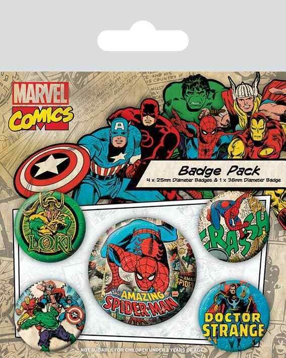 Marvel Comics Ansteck-Buttons 5er-Pack Classic Spider-Man Iron Man Hulk Captain America Batman Avengers Pack mit jeweils 5 offiziell lizenzierten Ansteck-Buttons. Durchmesser: - 4x 2,5 cm - 1x 3,8 cm Incl. Versand