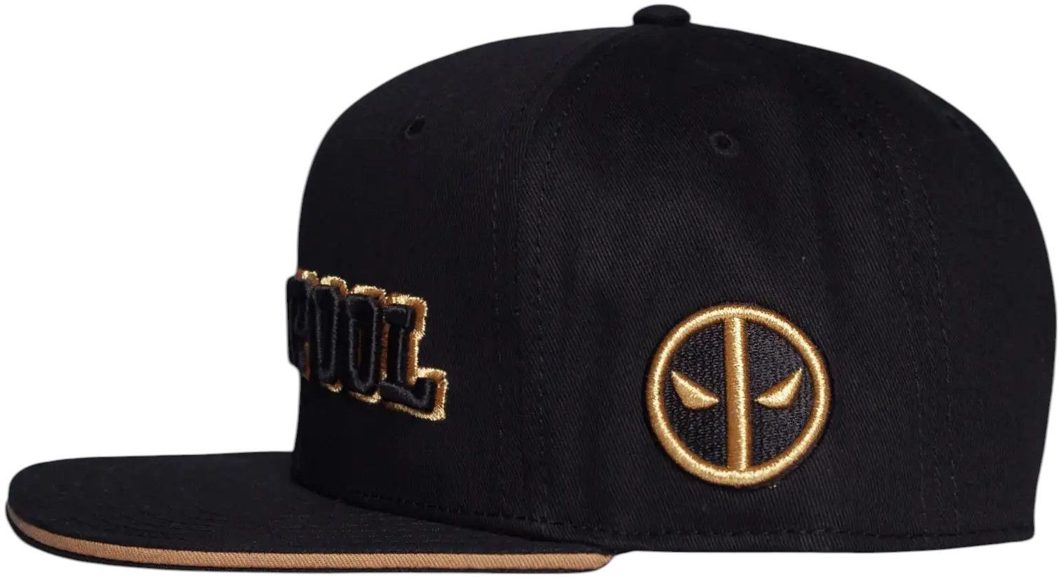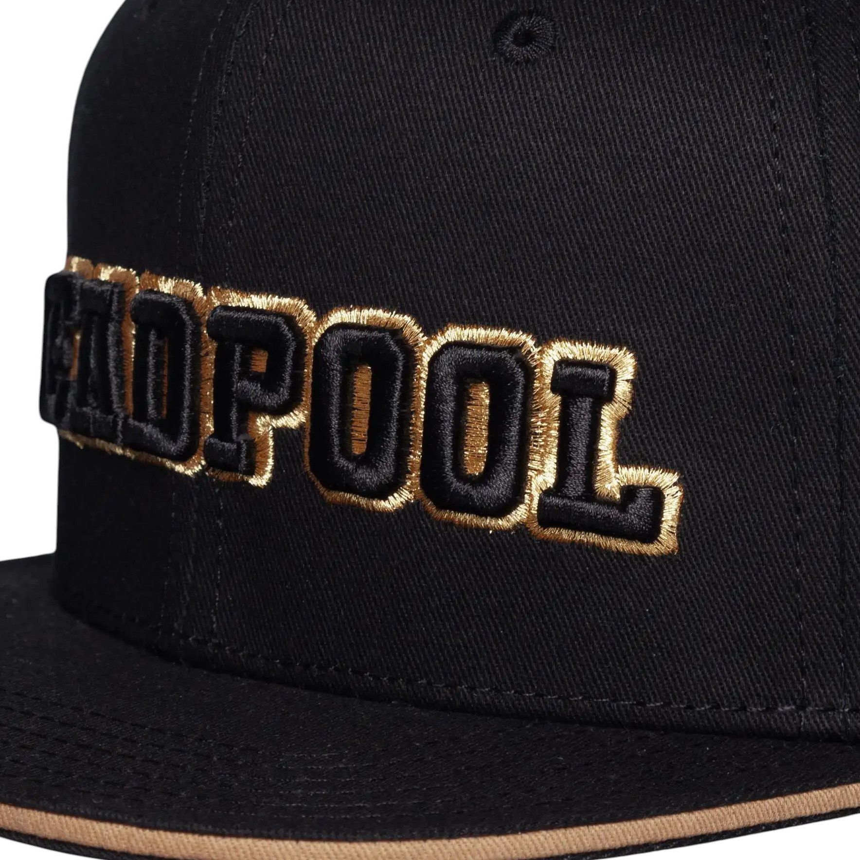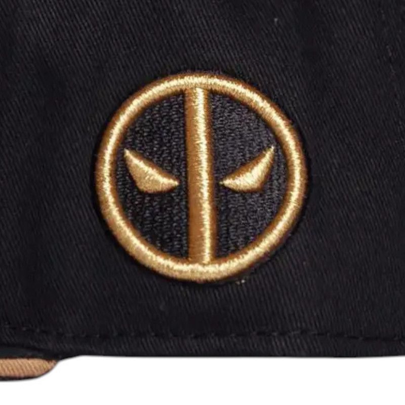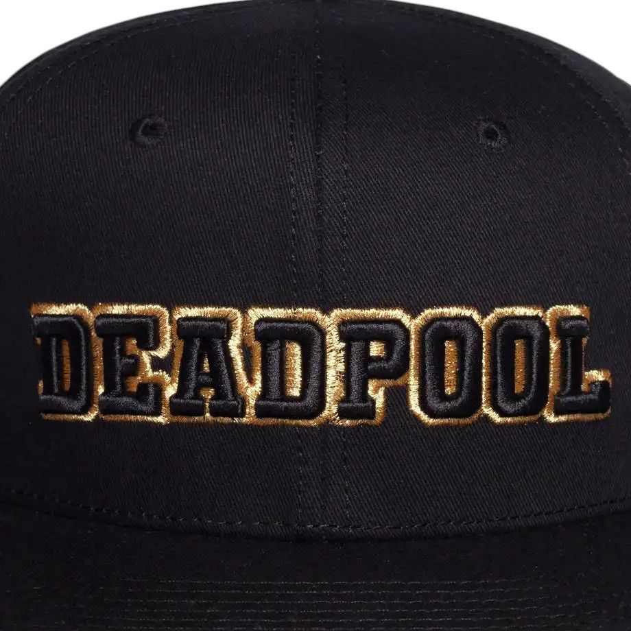 Deadpool Snapback Cap. Schwarze Marvel-Kappe mit Comic-Design, 3D-Goldlogo