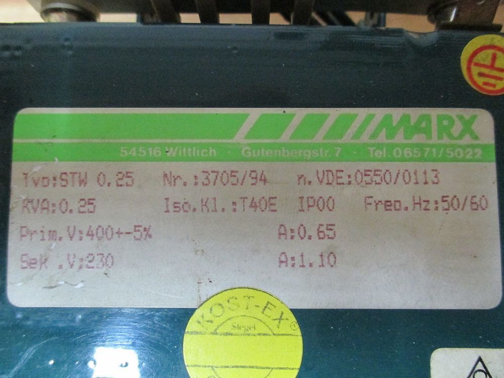 KOST-EX Elektrofachhandel Bestellnummer T 9 761 Marx Transformator STW 0,25 Trafo 250 VA pri. 400 V + - 5% pri. 0,65 A sec. 230 V sec. 1,1 A Maße L x B x H: 12
