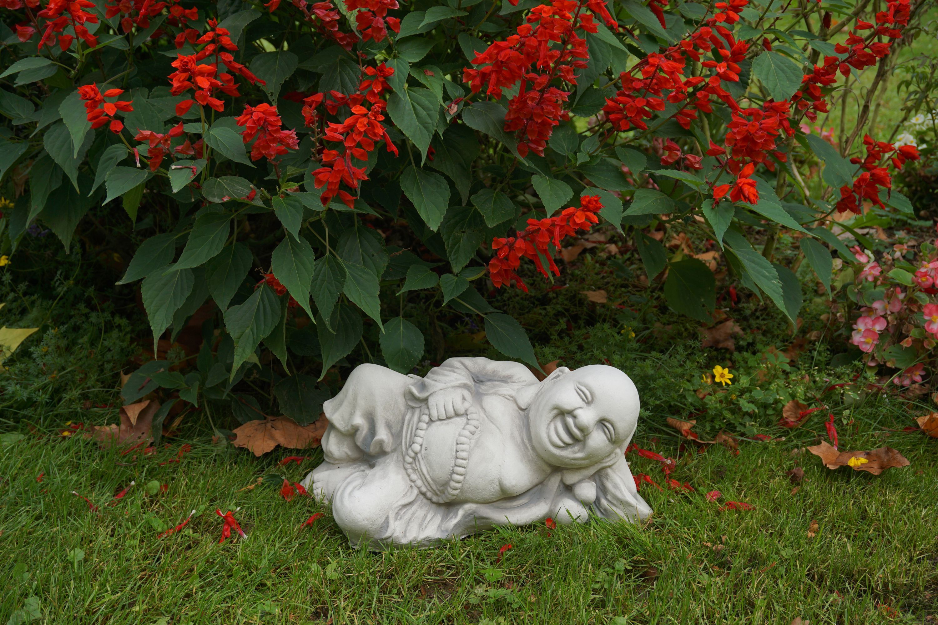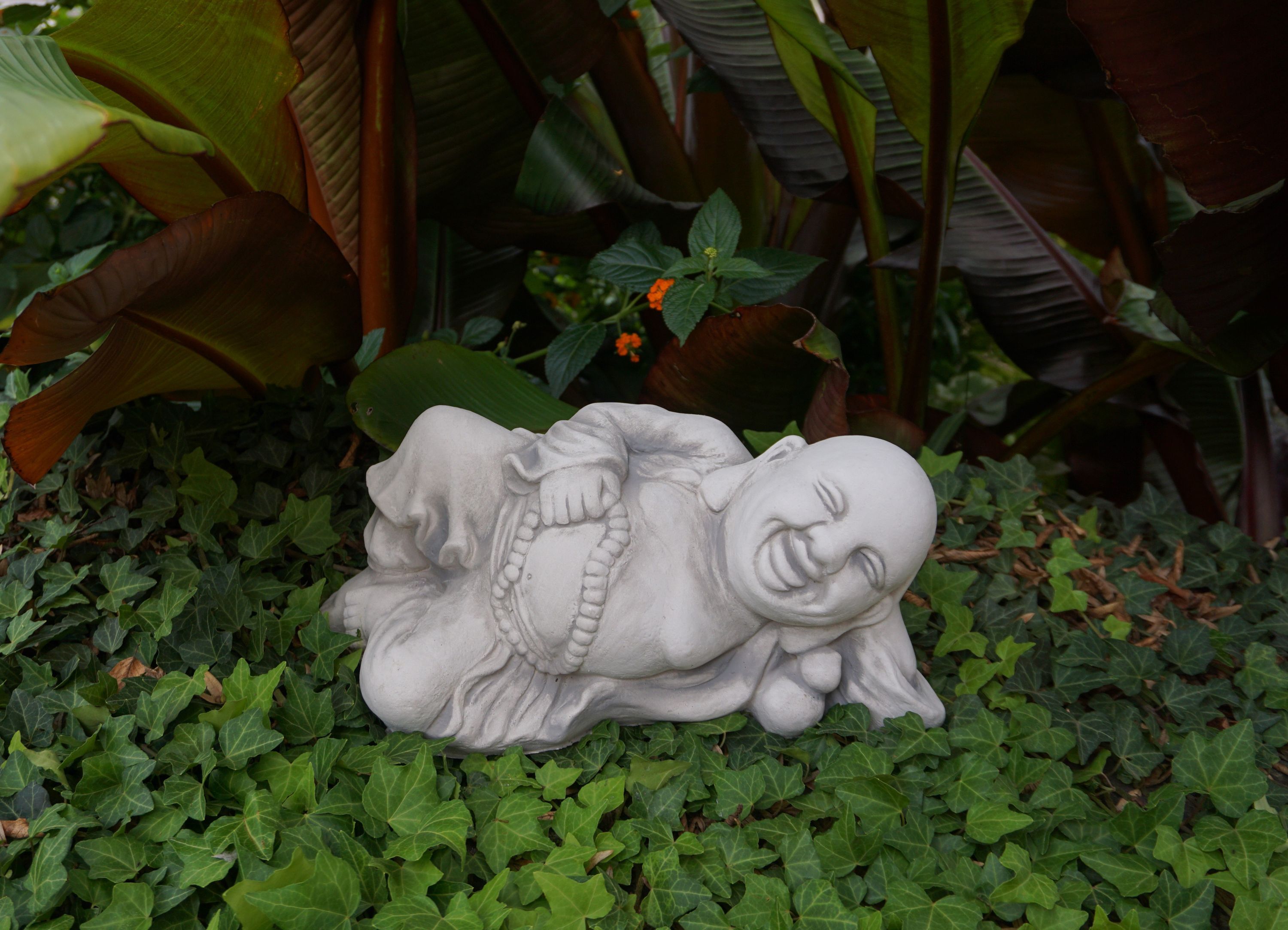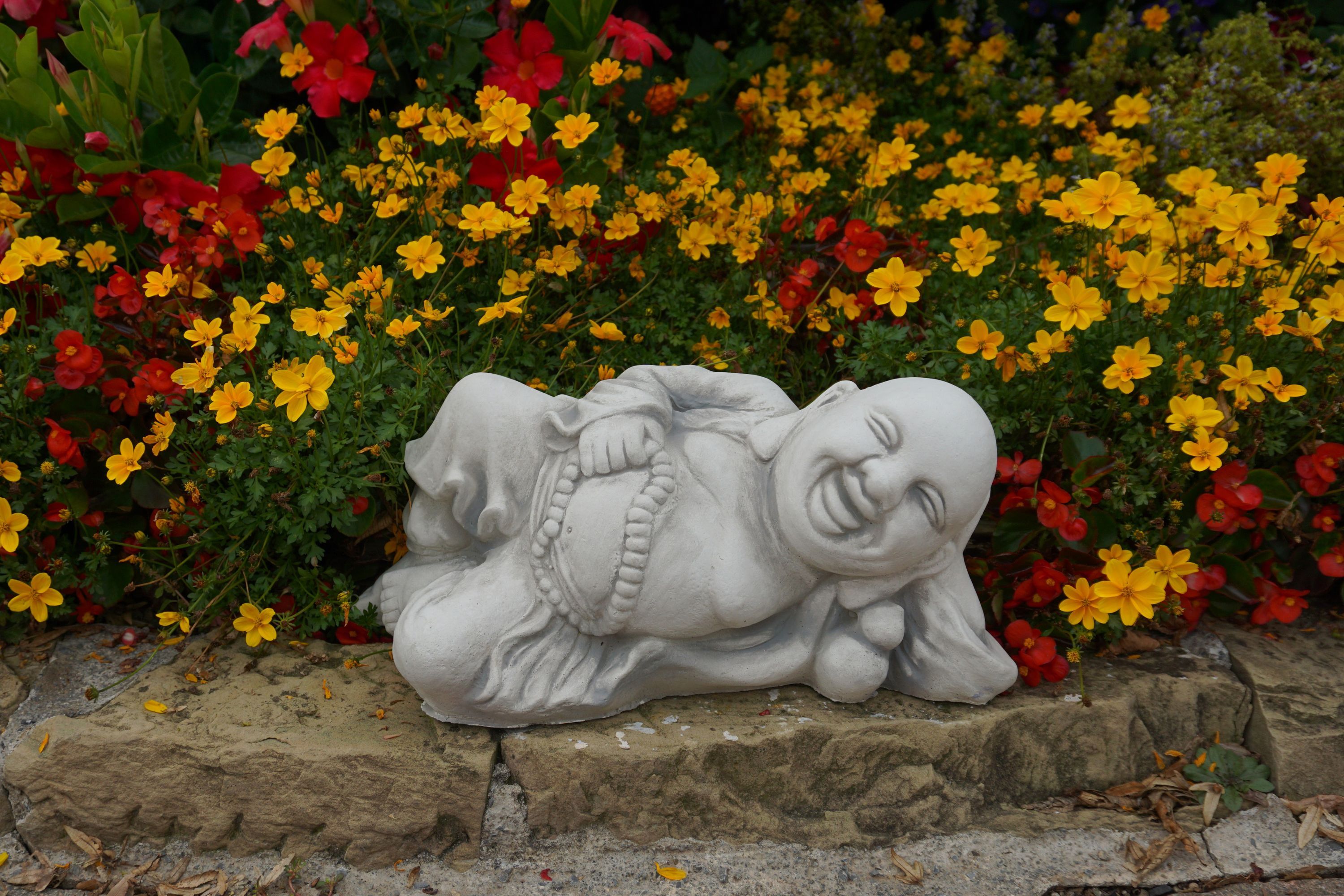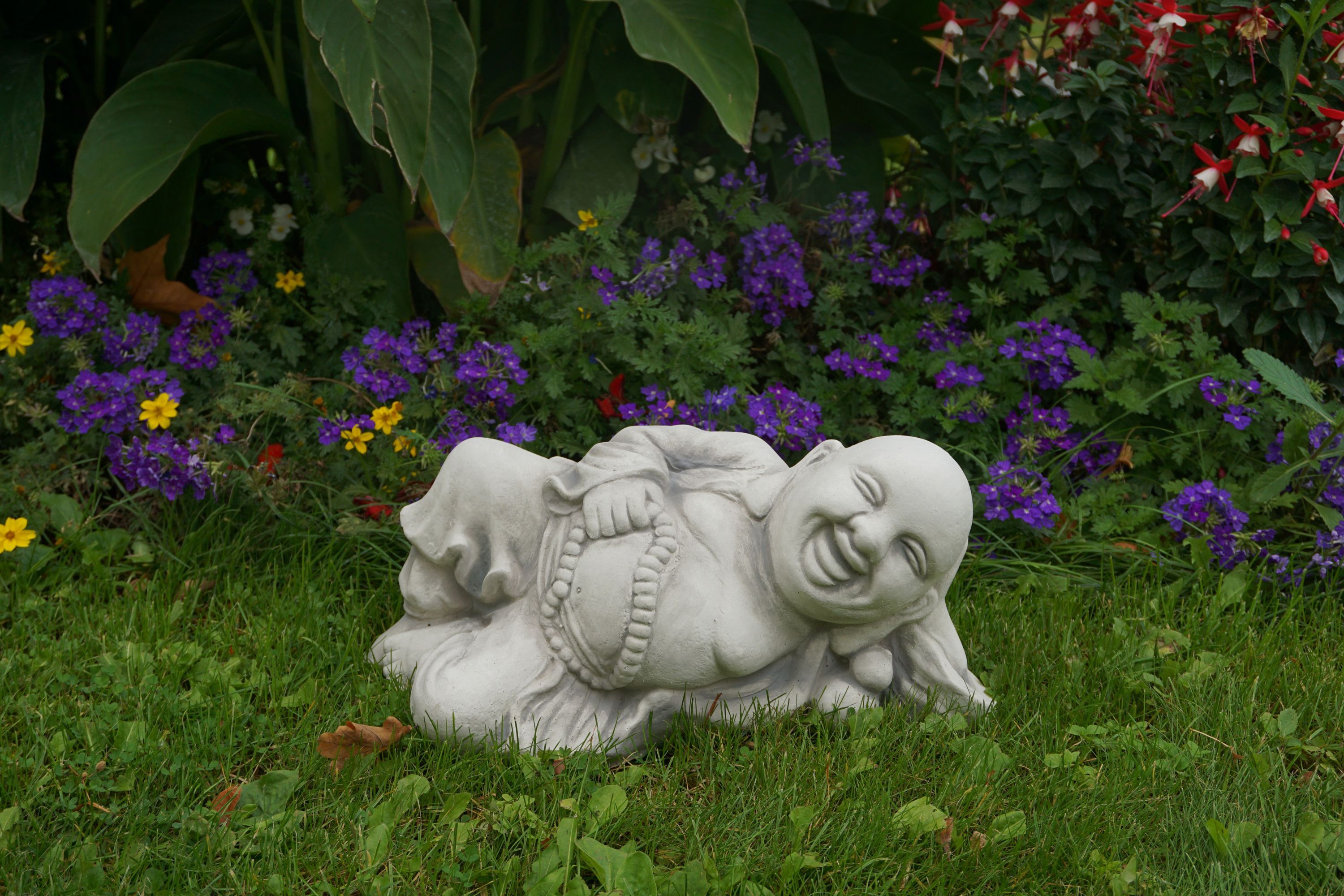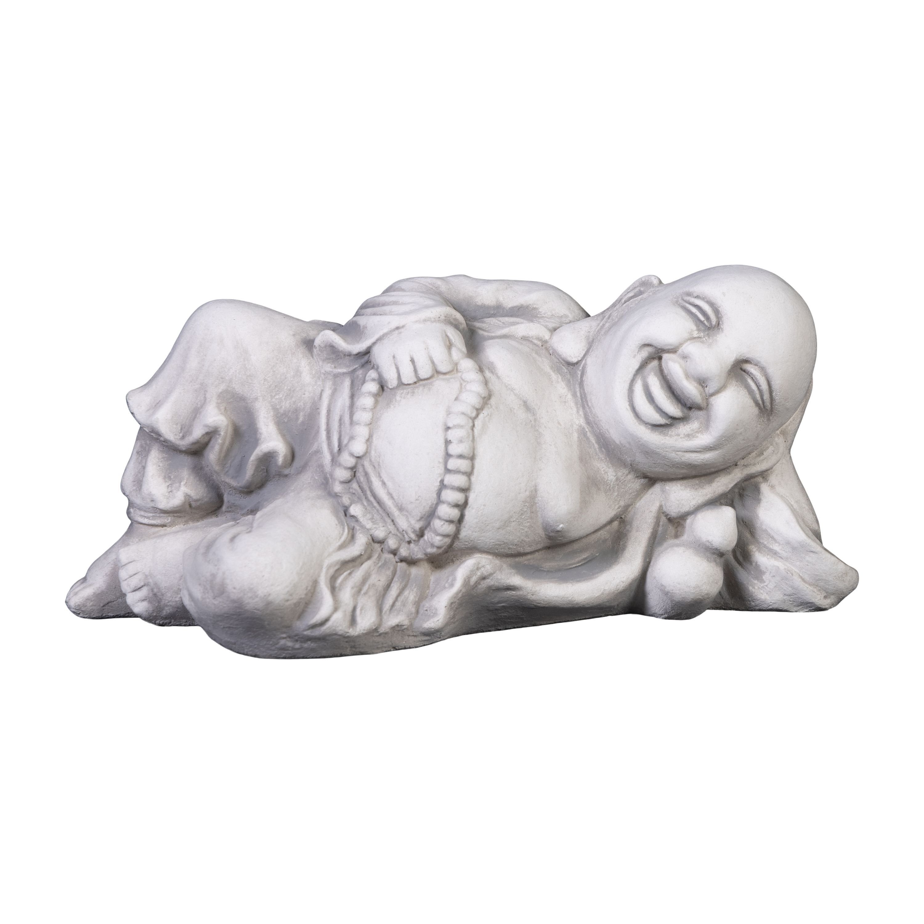 Massive Steinfigur lachender Buddha liegend Mönch aus Steinguss frostfest (Gr. 41 cm)
