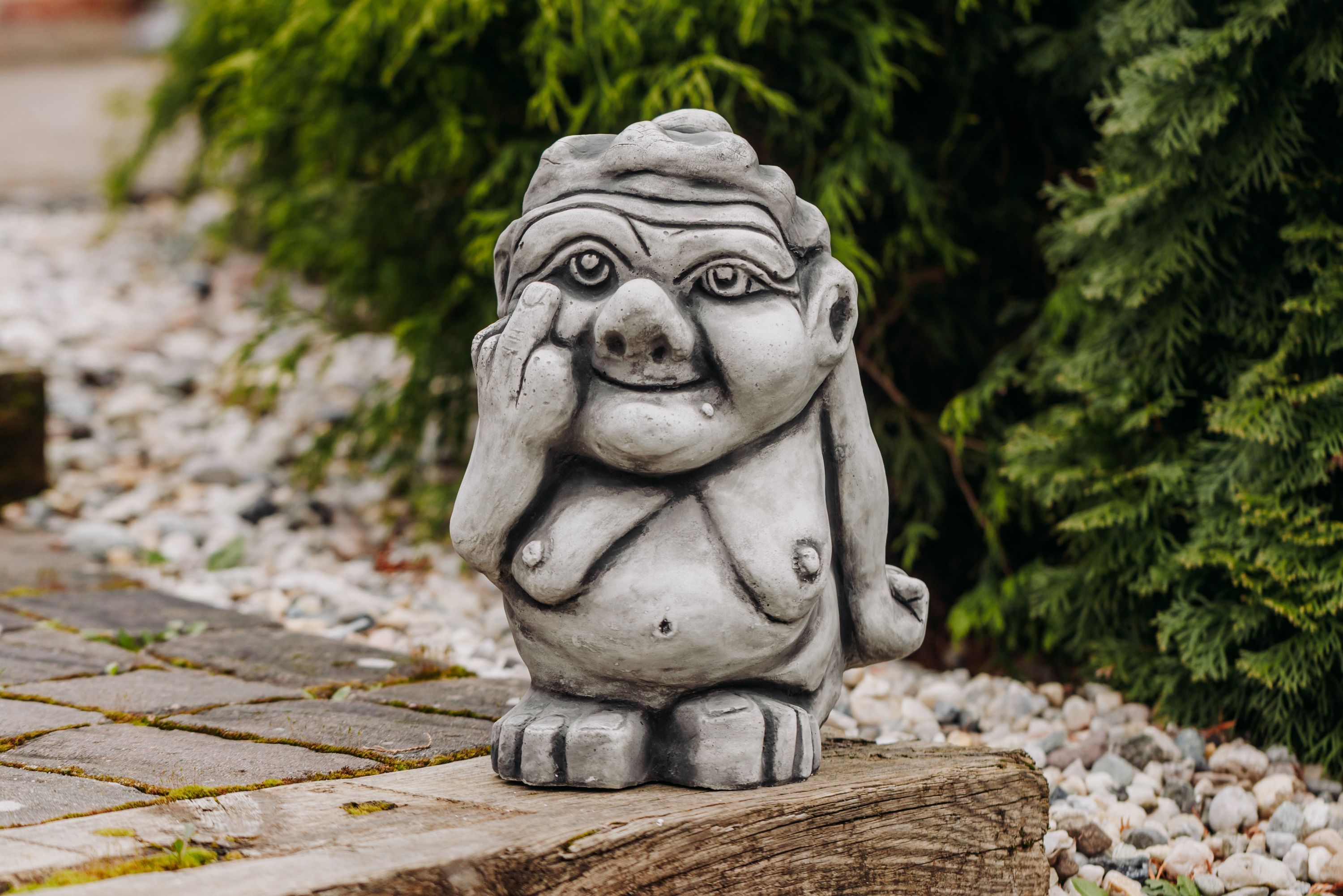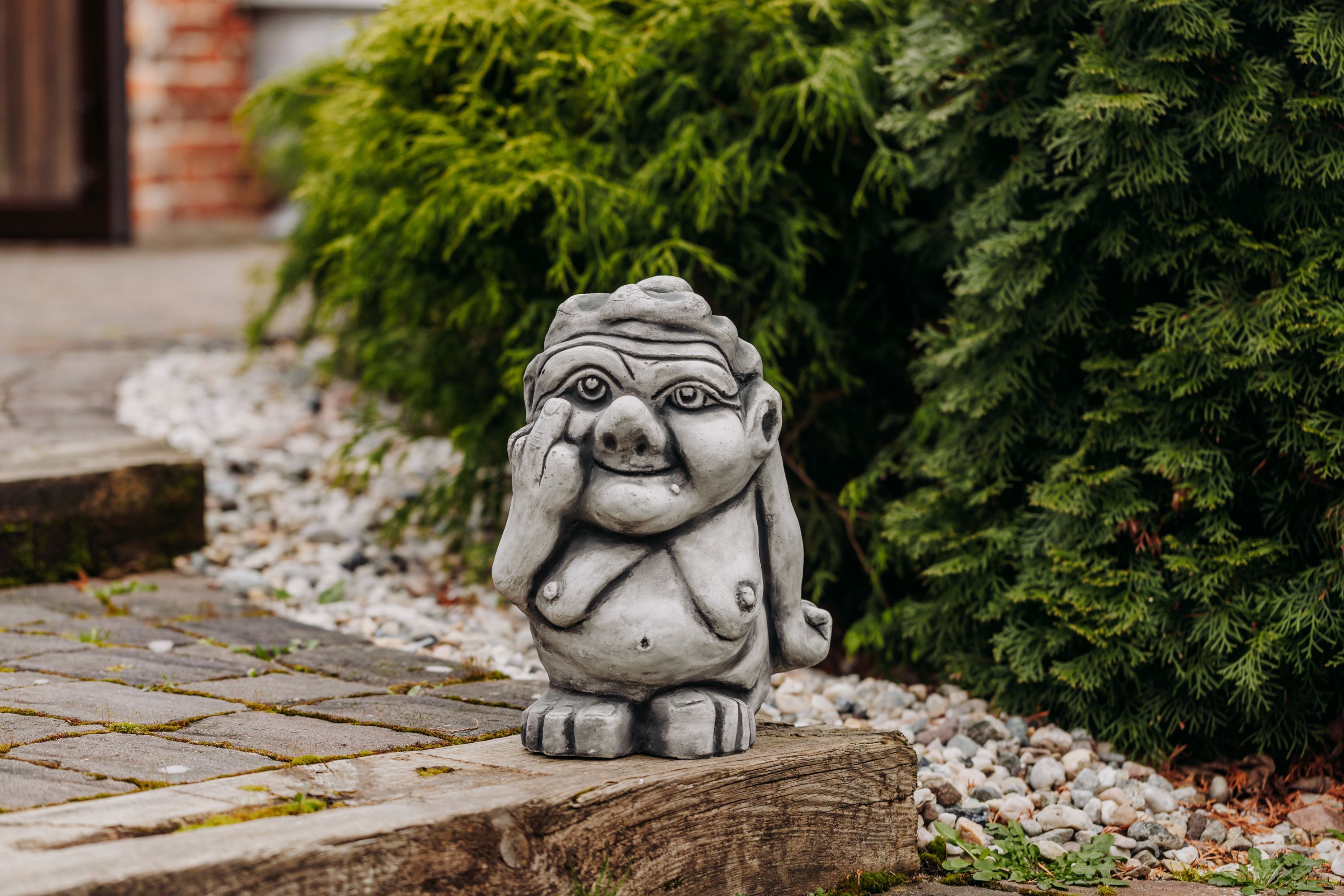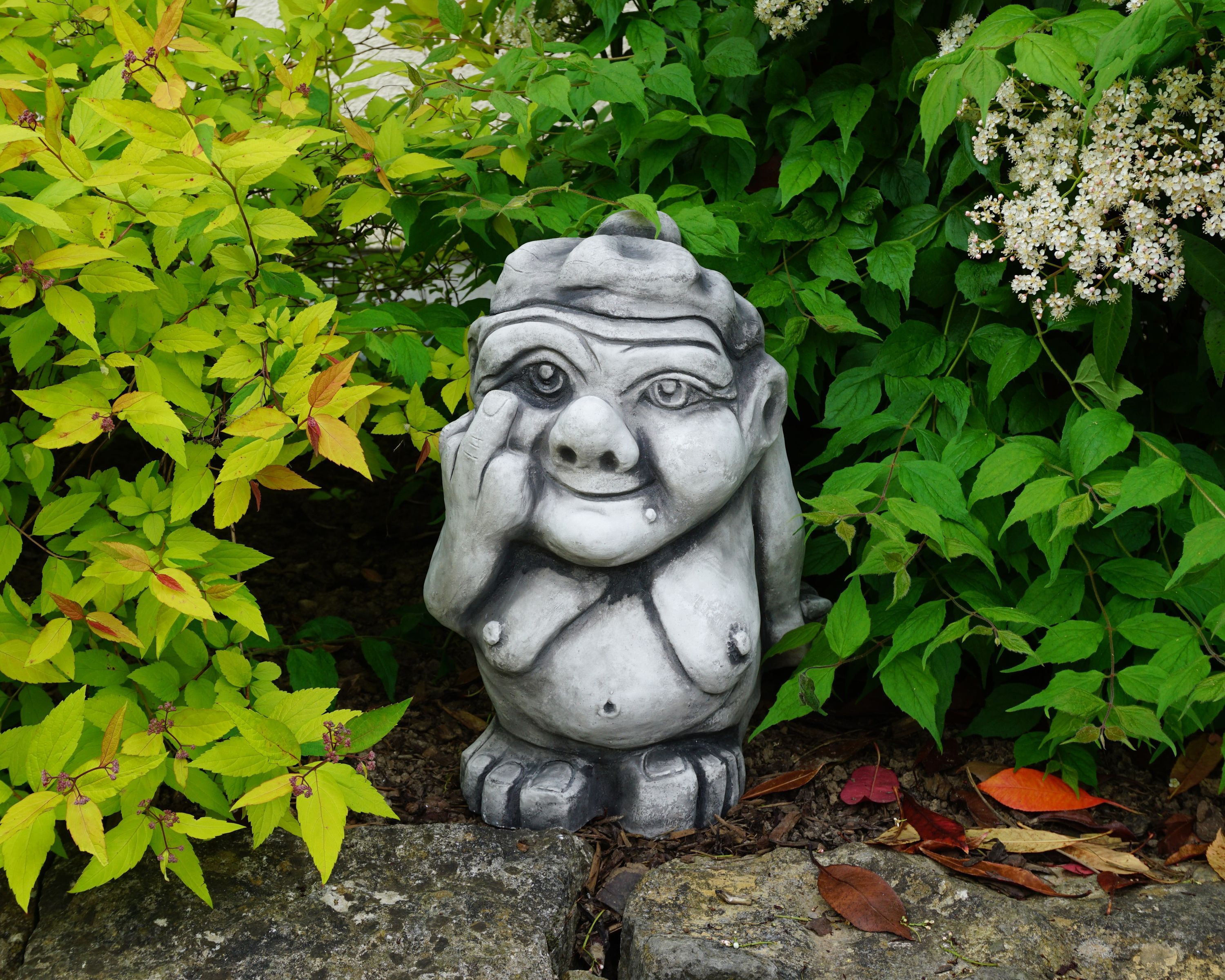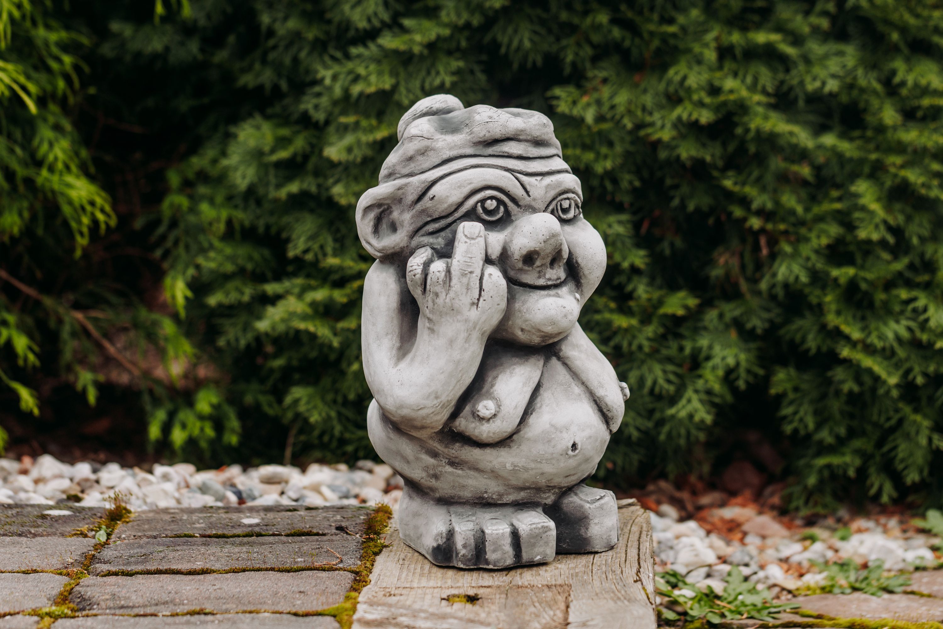 Massive Steinfigur lustiger XXL Troll Oma mit Mittelfinger Steinguss frostfest