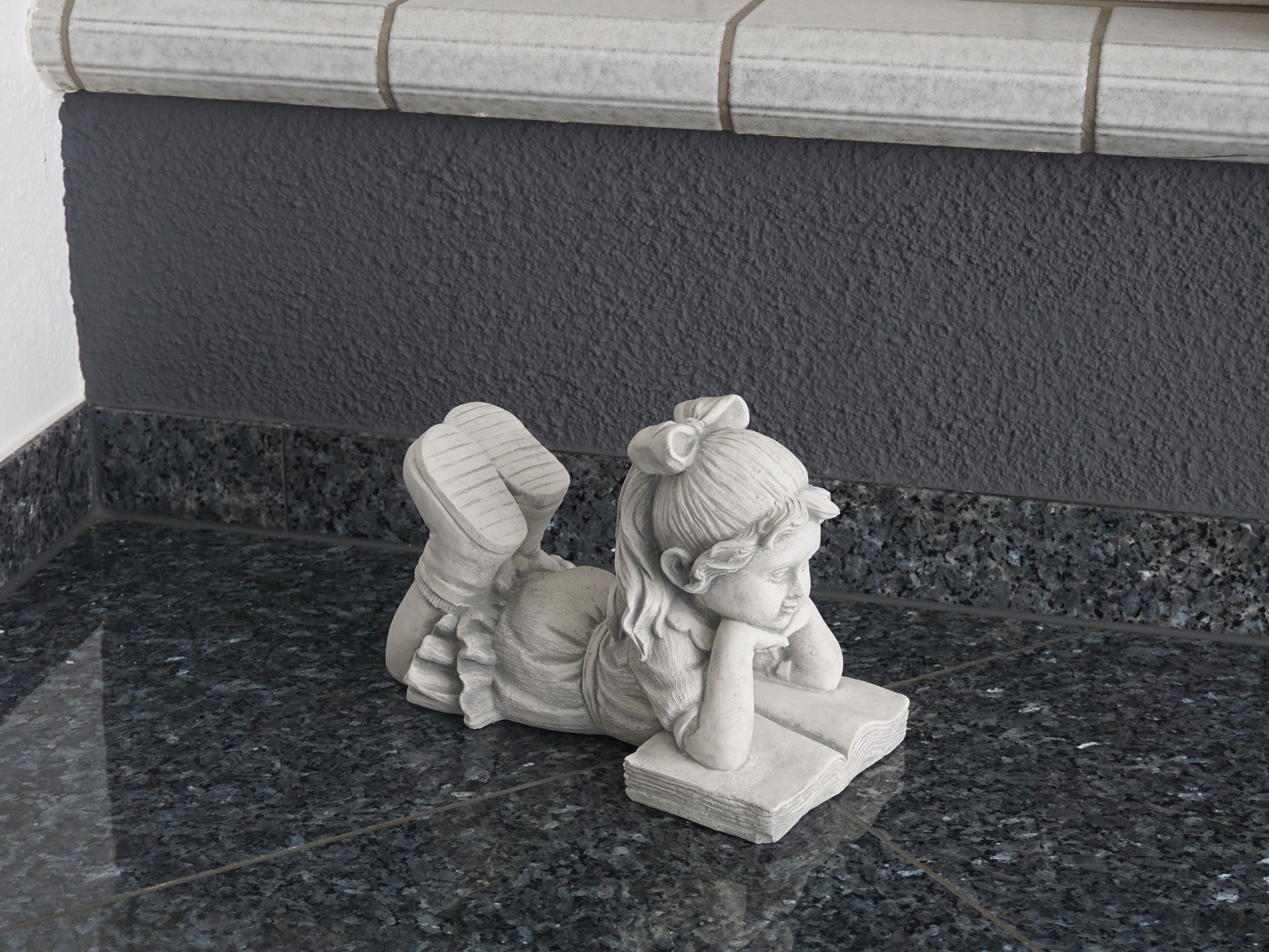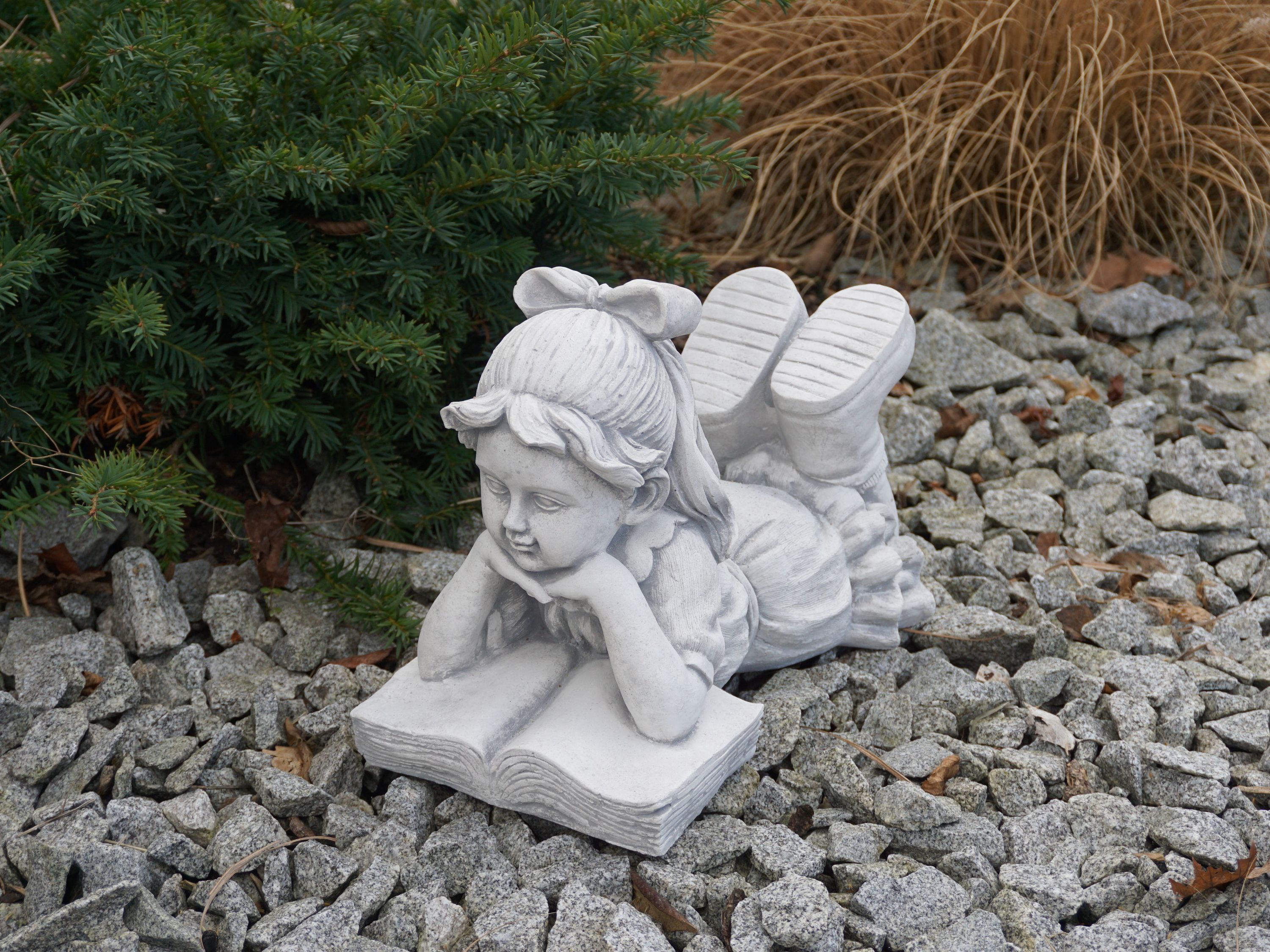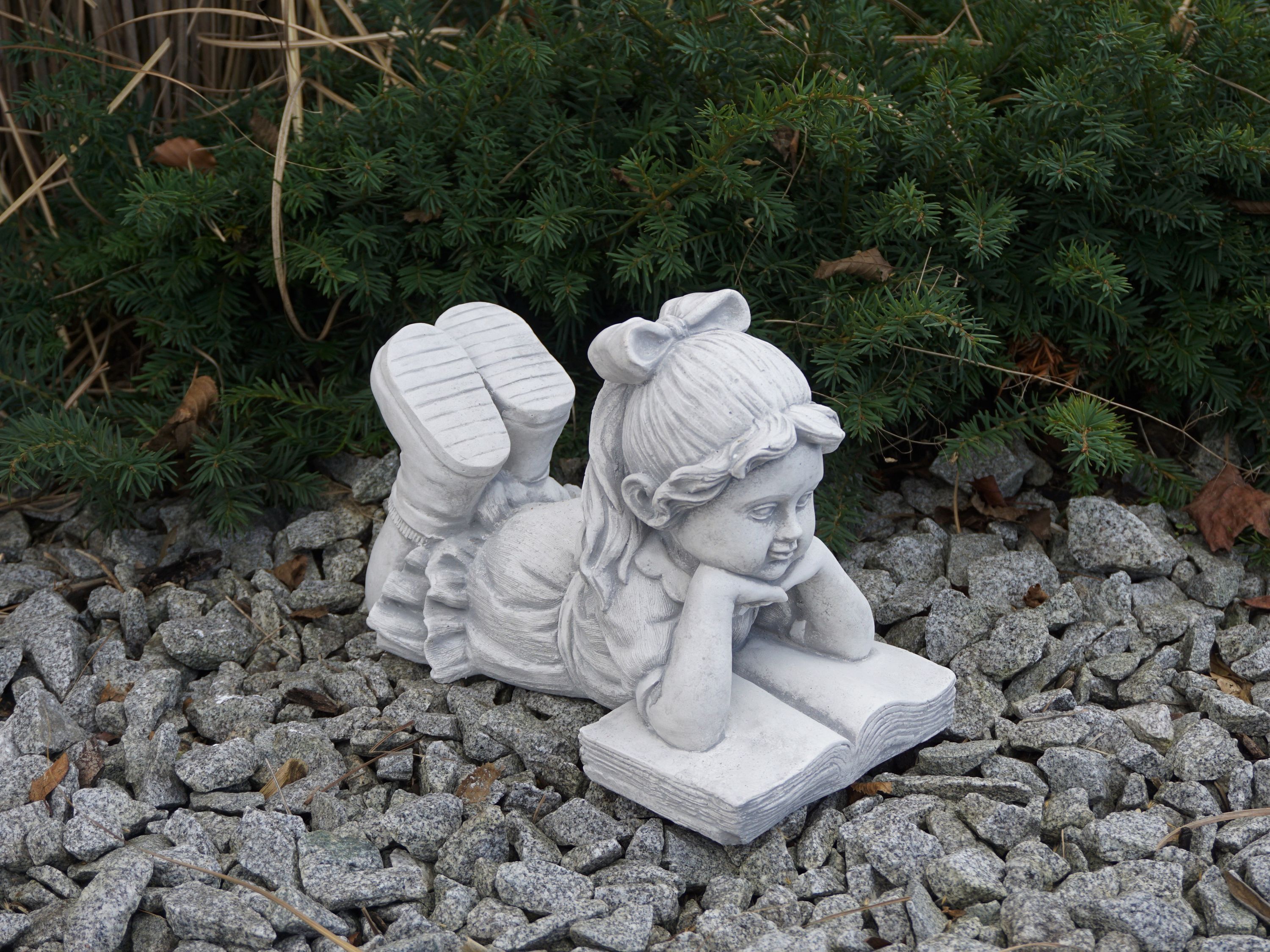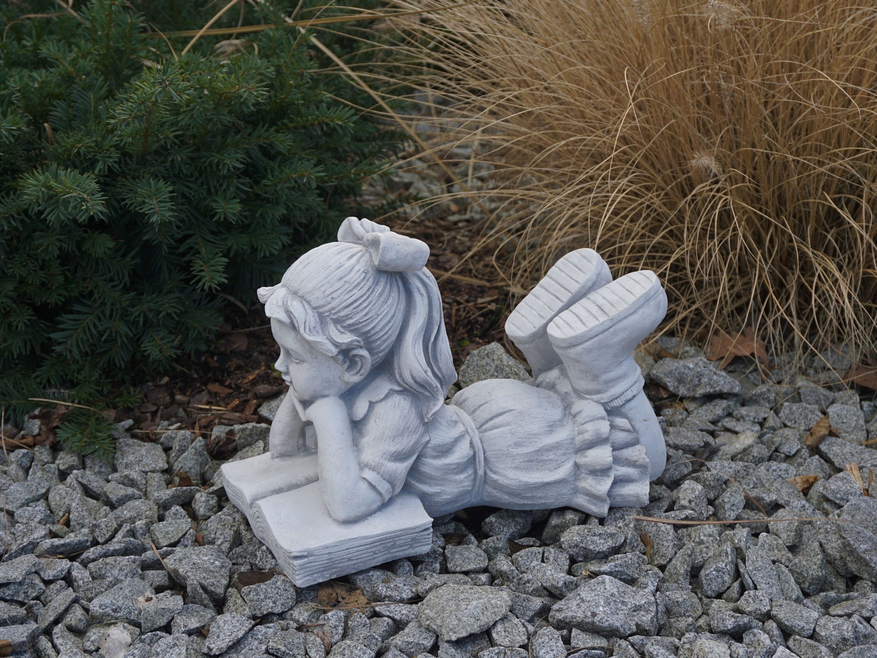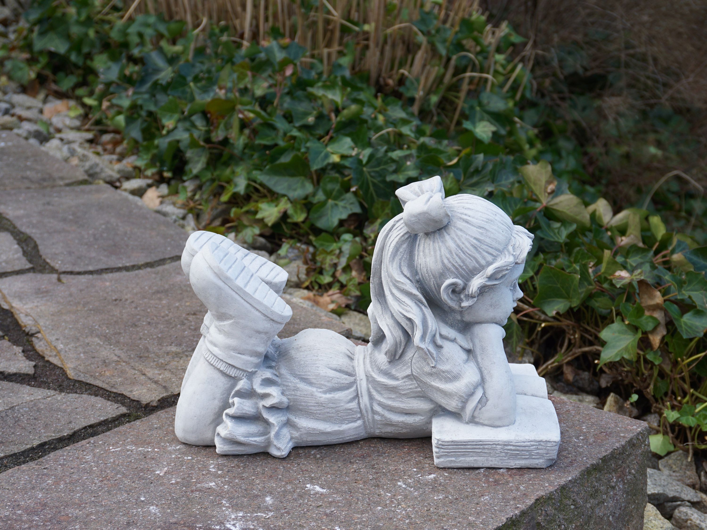Massive Steinfigur Mädchen mit Buch liegend Gartenfigur aus Steinguss frostsiche