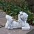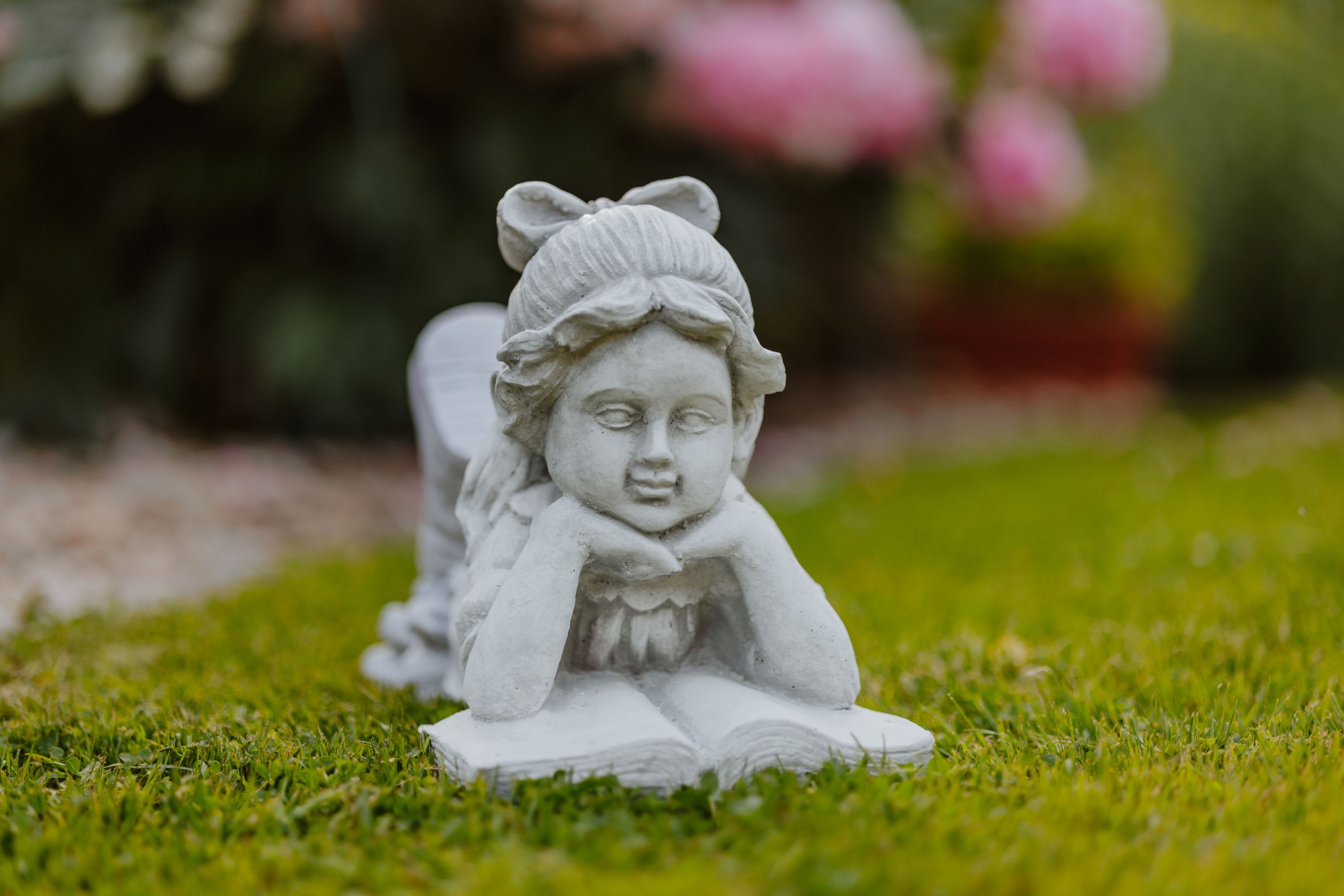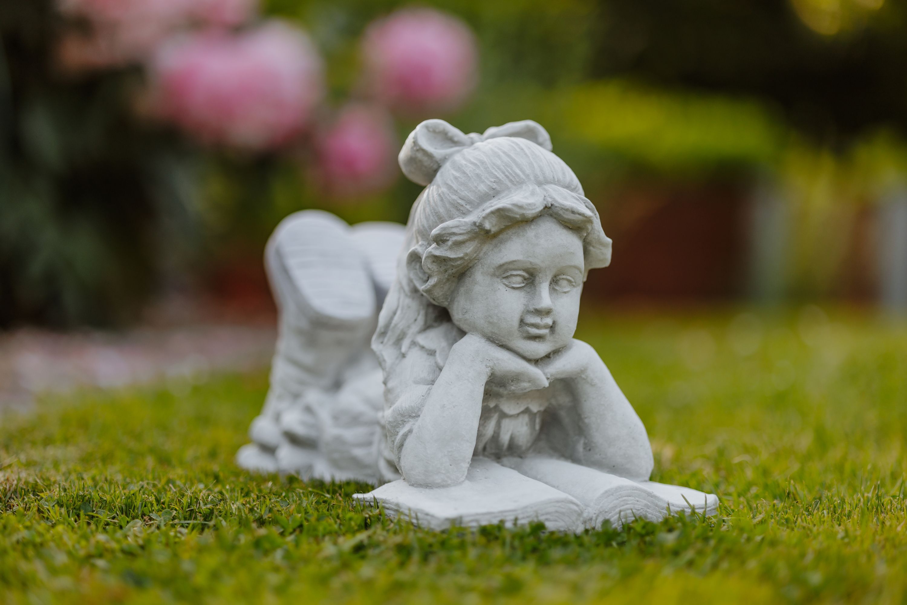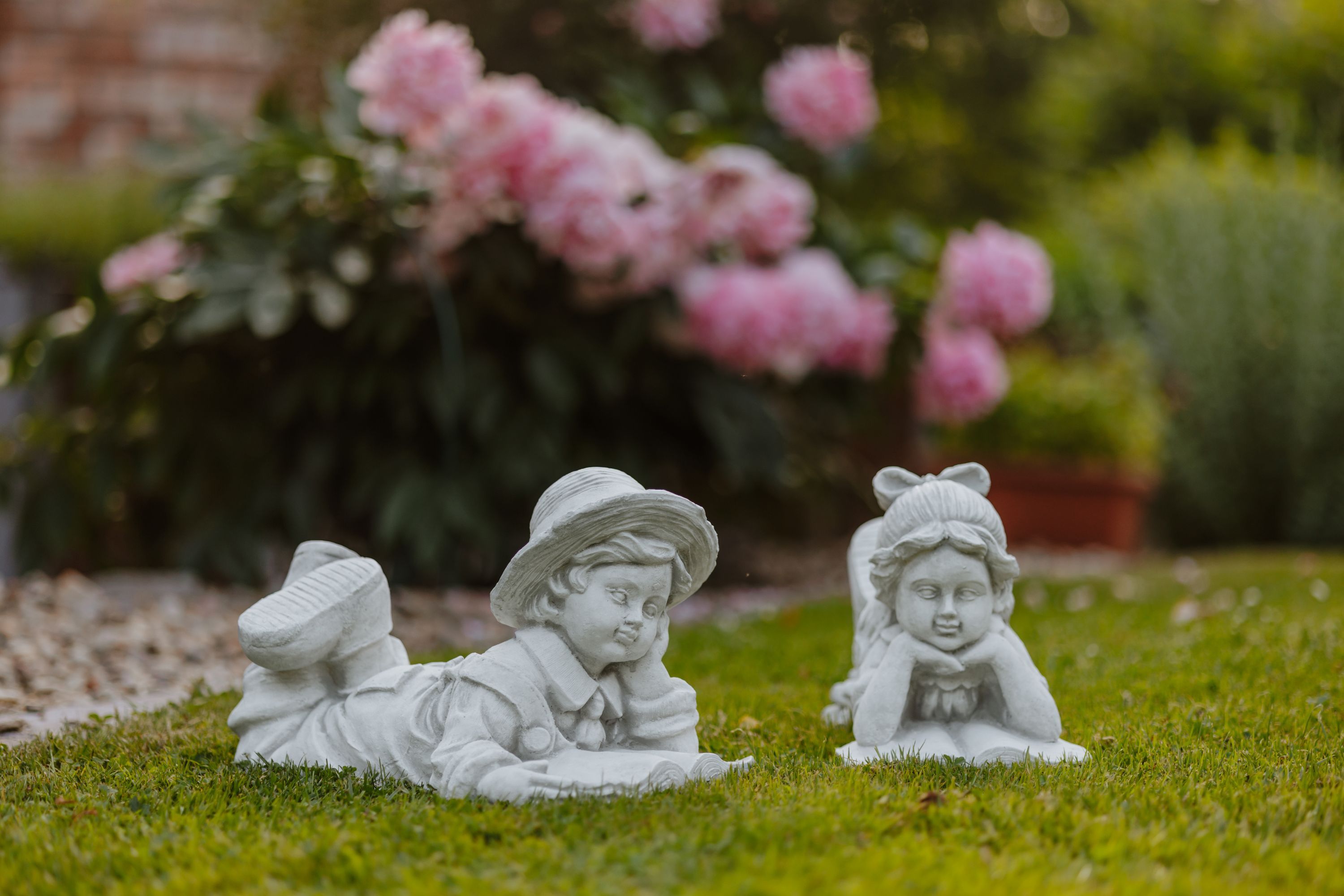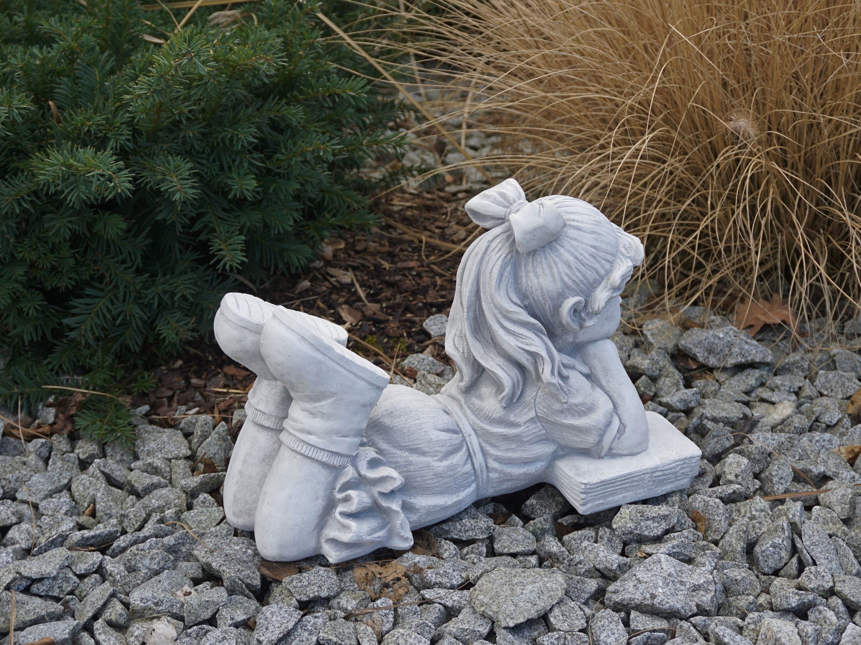 Massive Steinfigur Mädchen mit Buch liegend Gartenfigur aus Steinguss frostsiche
