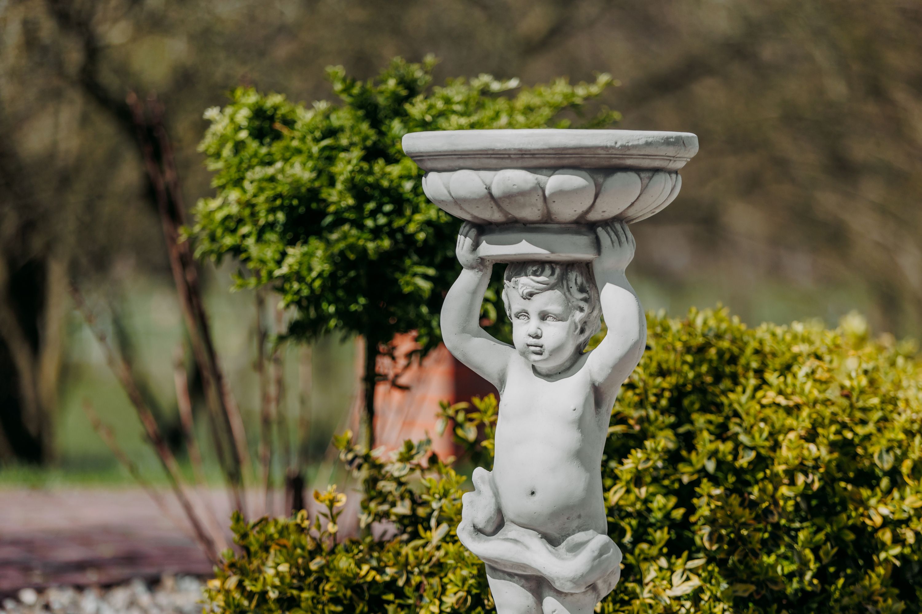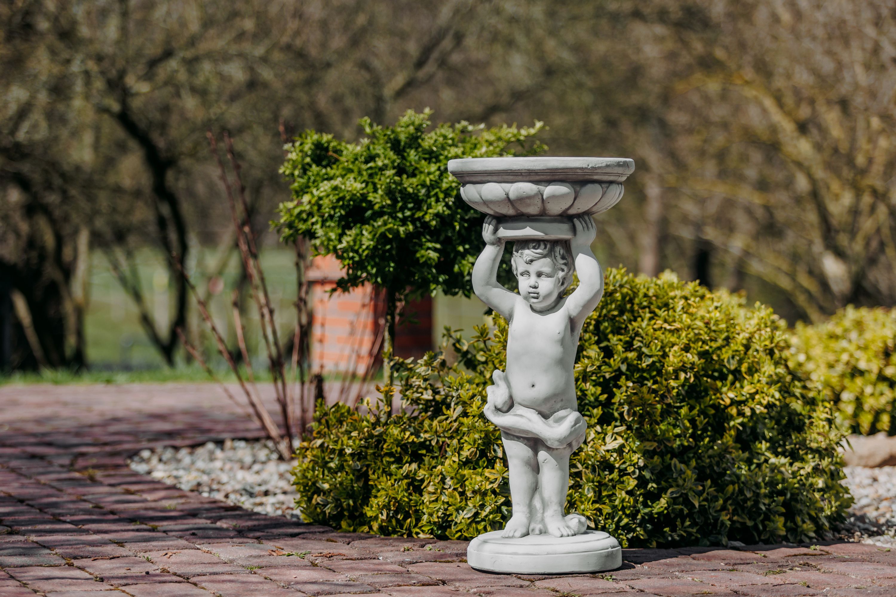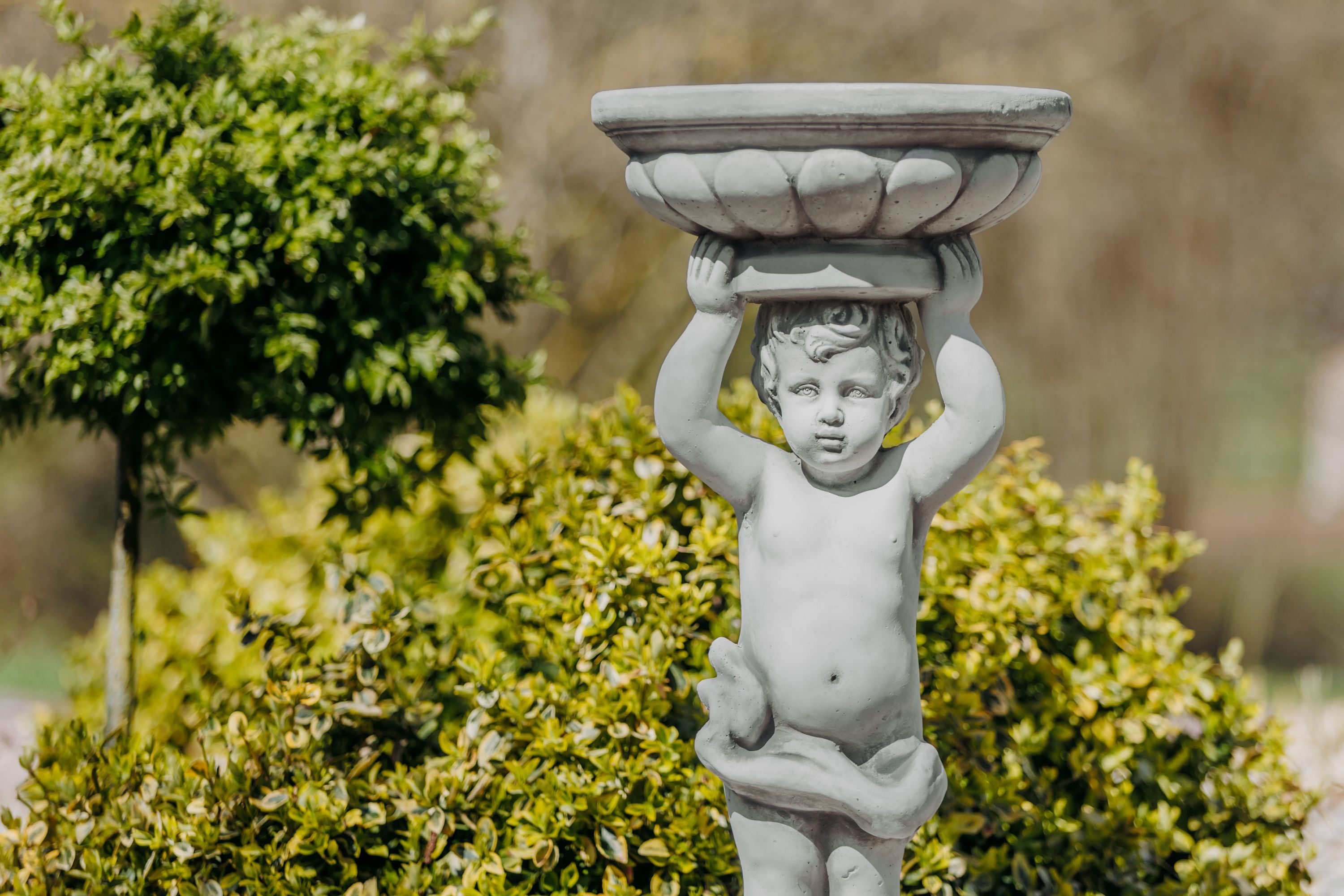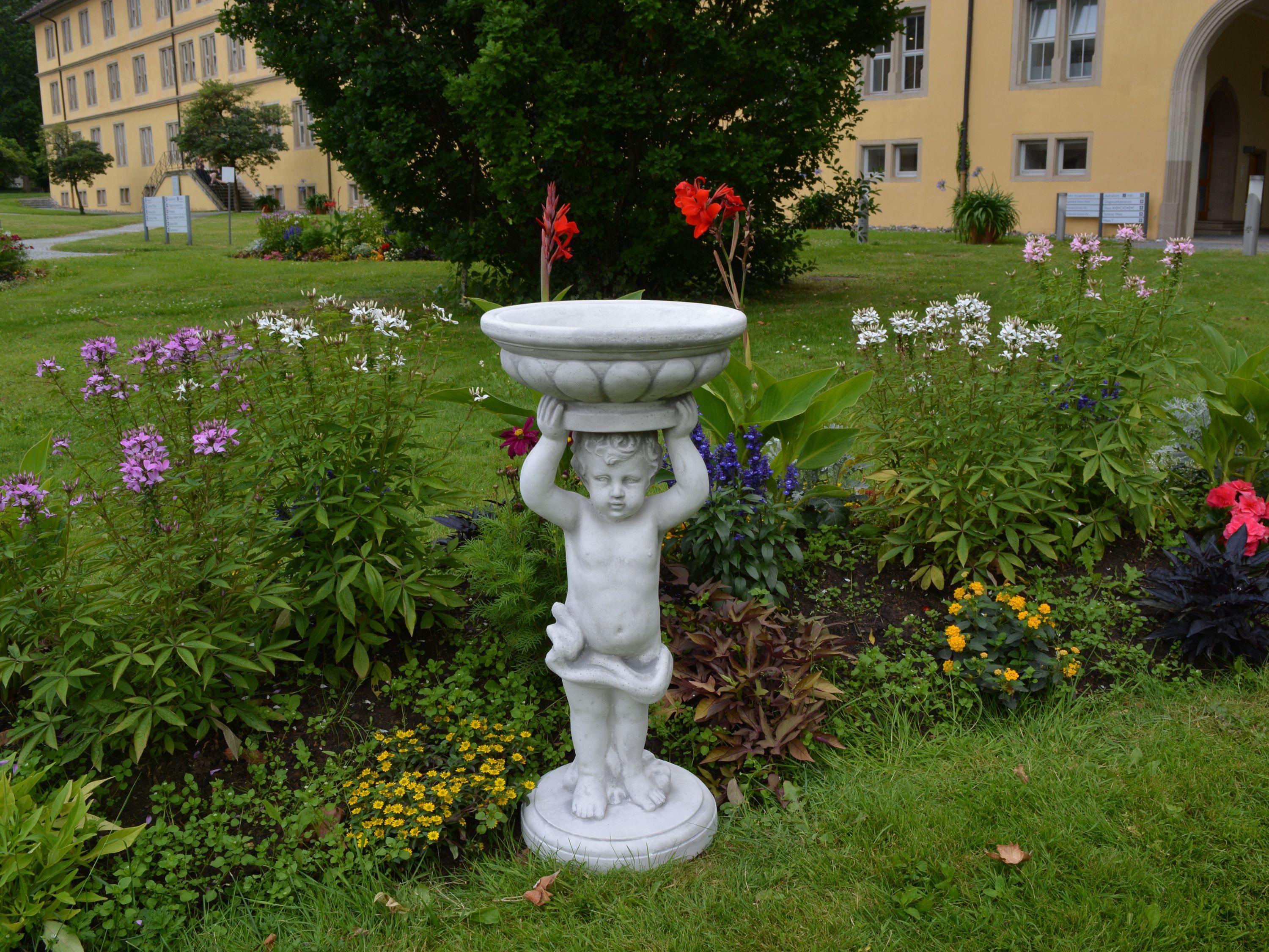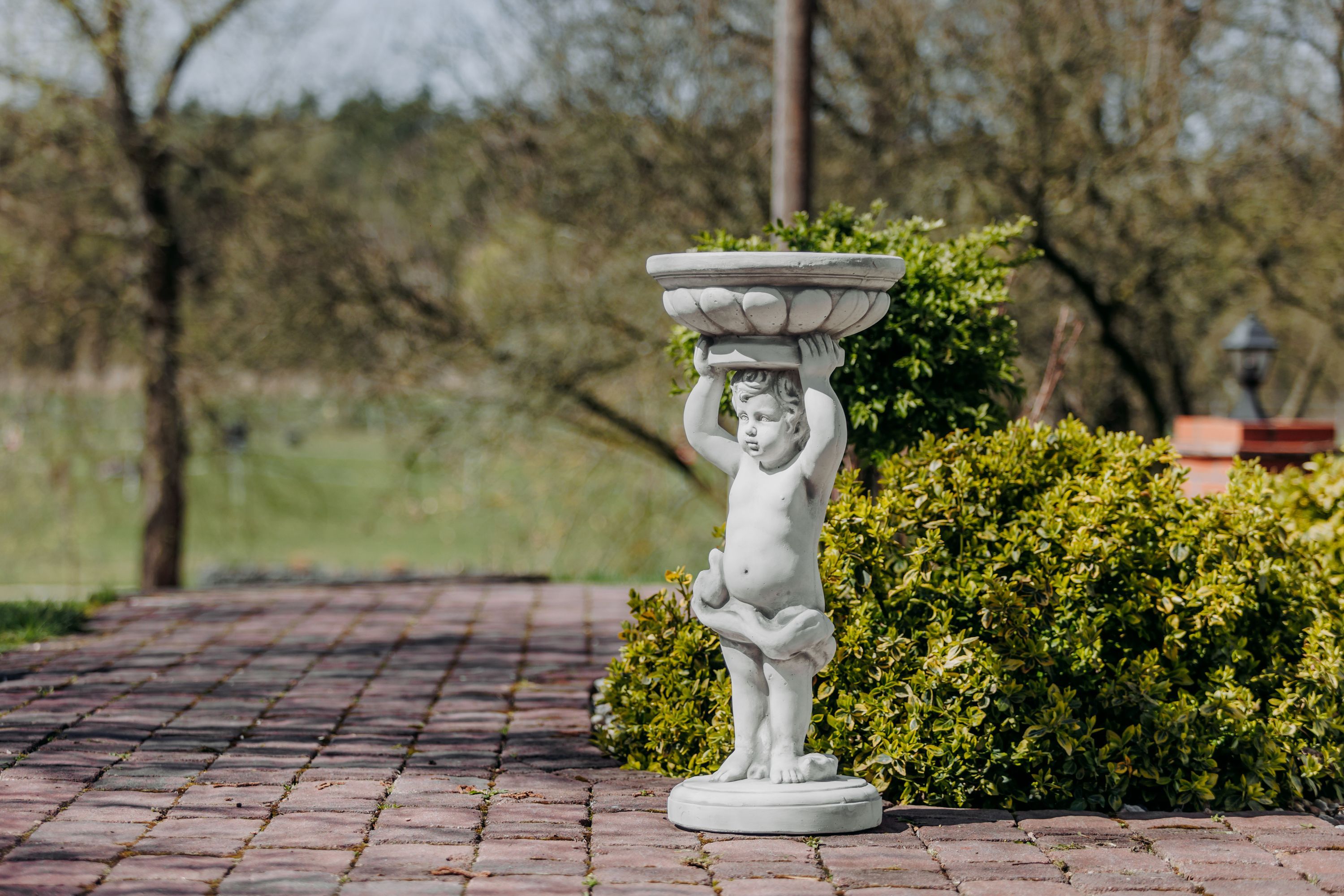 Massive Steinfigur Statue Blumensäule mit Junge Pflanzgefäß Steinguss frostfest