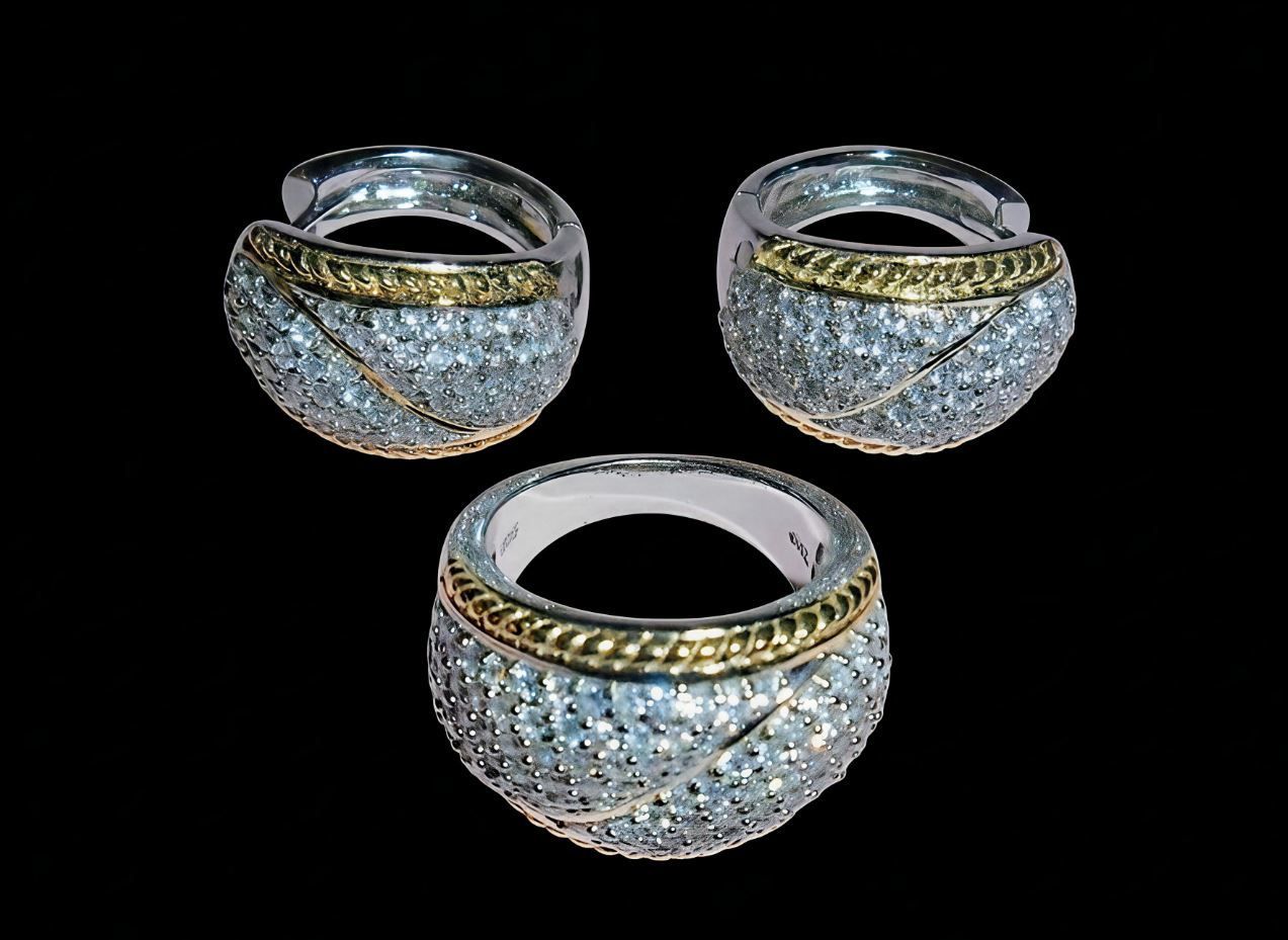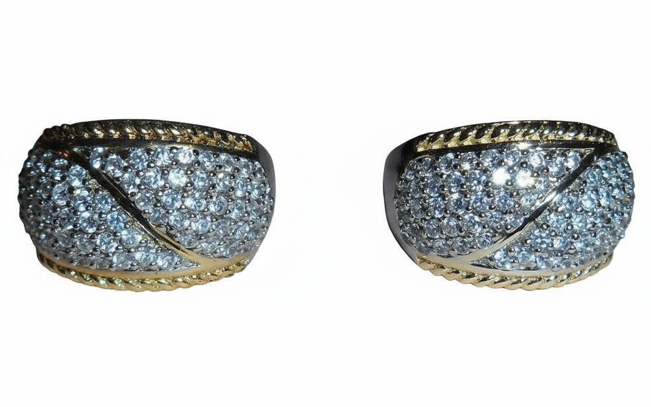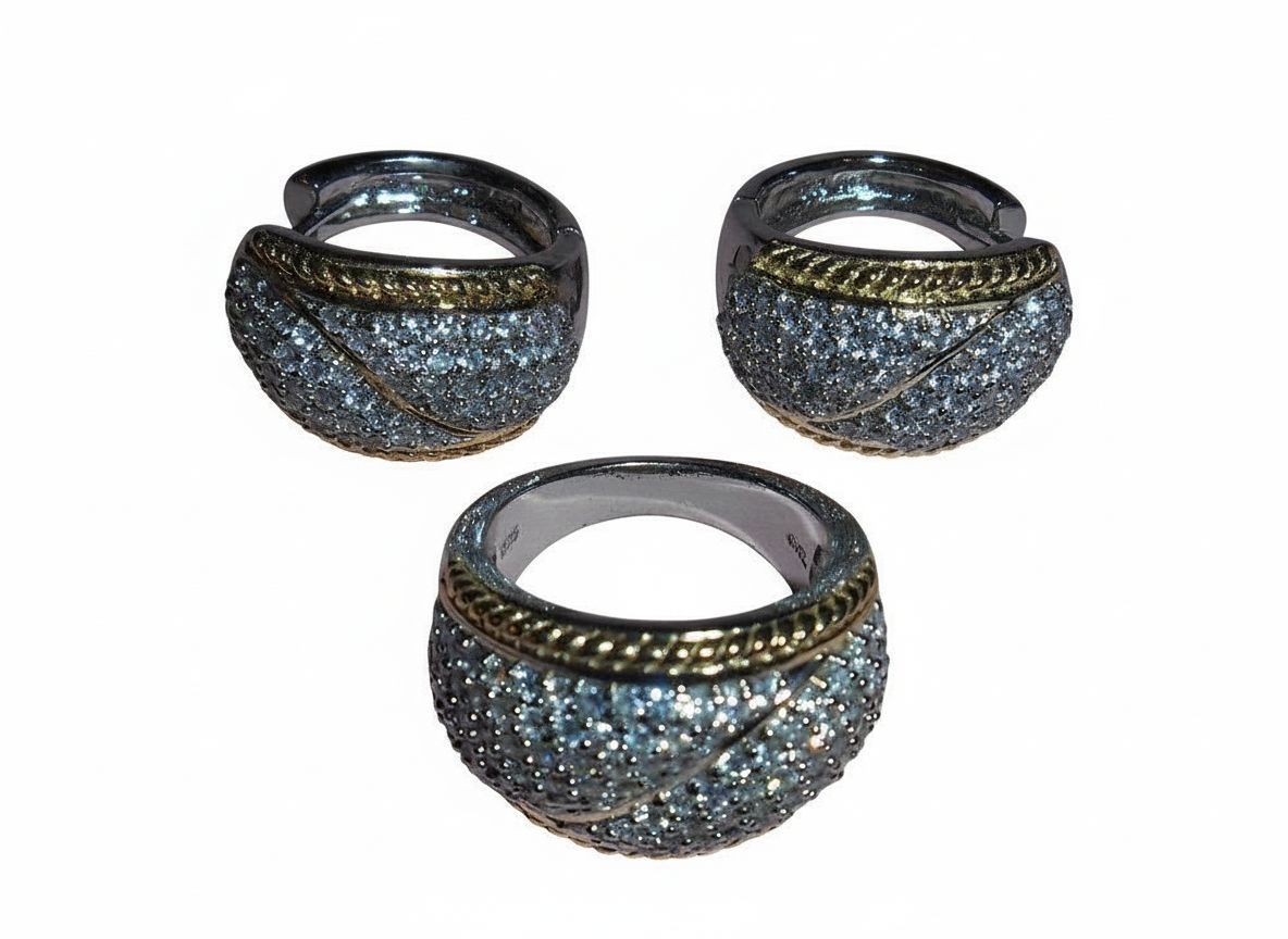 1 Paar Creolen + Ring 925er Silber rhodiniert teilvergoldet mit klaren Zirkonia Ring: Größe: 17,4 mm Ø Gewicht: 11,2 g Creolen: Größe: 20 x 12,5 x 22 mm Gewicht: 15 g Hersteller: Guel Gesamtgewicht: 26,2 g