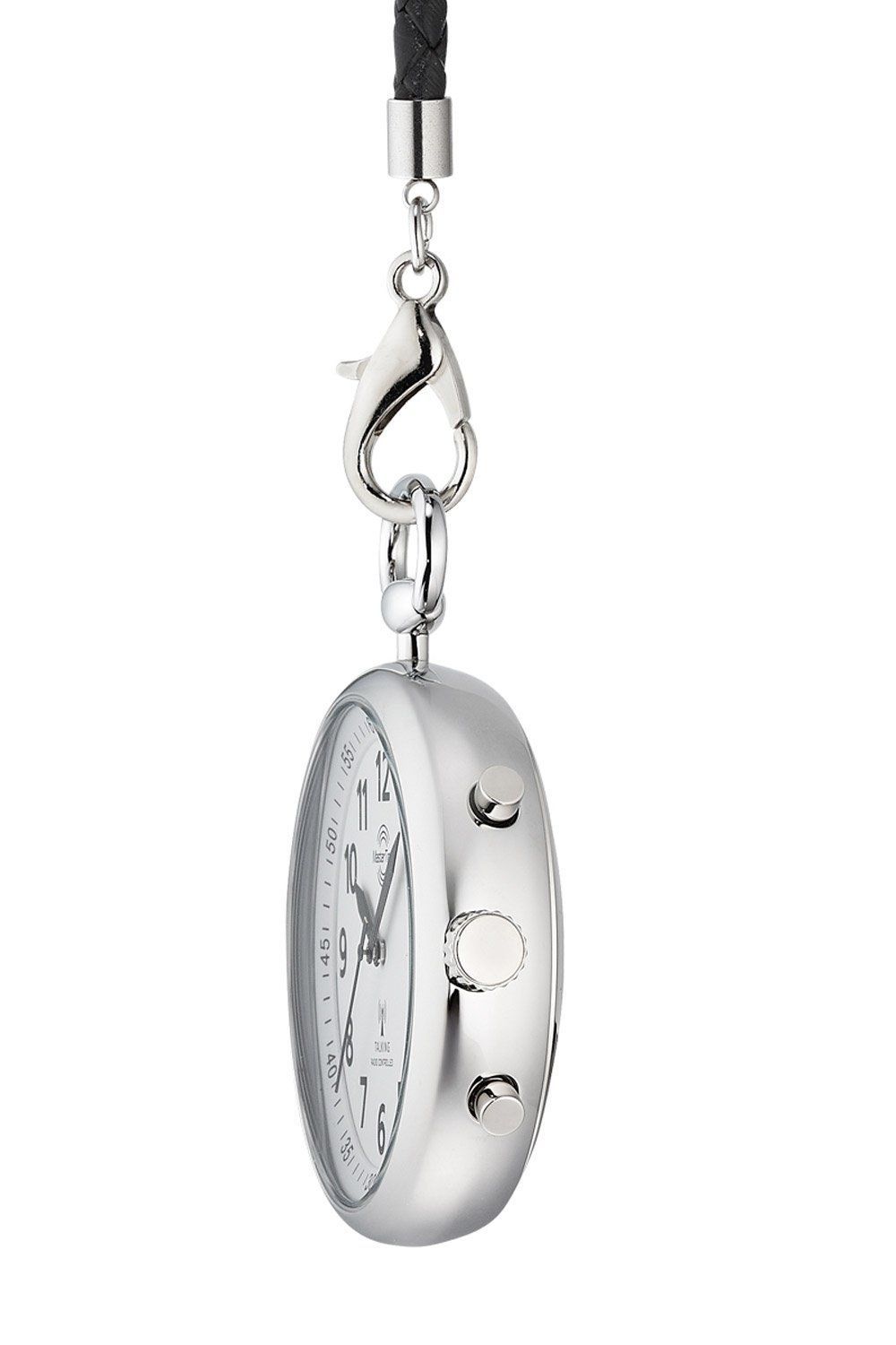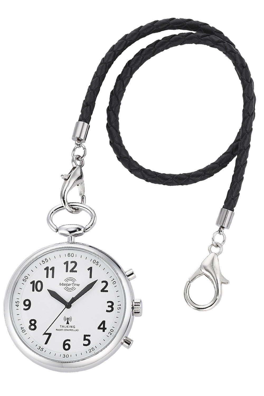 Funkuhr mit deutschsprachiger Zeit- und Datumsansage, 3-Zeiger Funk-Uhrwerk TD2431, empfängt das Zeitsignal DCF77 aus Mainflingen, Deutschland, funkgesteuerte automatische Zeitumstellung von Sommer- und Winterzeit, 4 individuell einstellbare Alarme, weißes Zifferblatt, schwarze Zeiger und Zahlen, Gehäuse aus poliertem Metall, geschraubter Kunststoff-Gehäuseboden, kratzunempfindliches Mineralglas, geflochtenes Lederband in Schwarz, 30 cm lang, sichere Karabiner-Verschlüsse, Breite (ohne Krone) 40