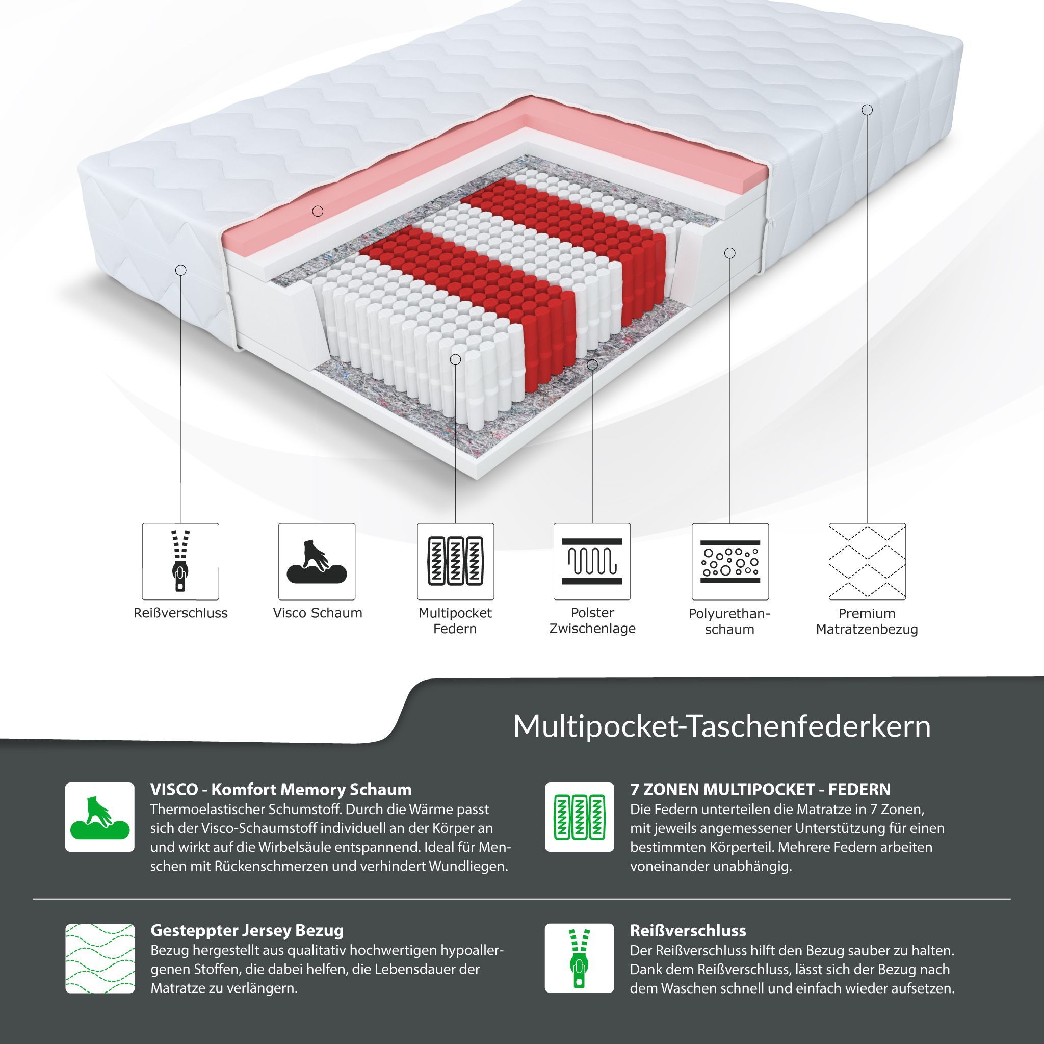 Matratze 100x200 Multipocket Taschenfederkern ATINA H3 Viscoschaum 7 Zonen 18 cm