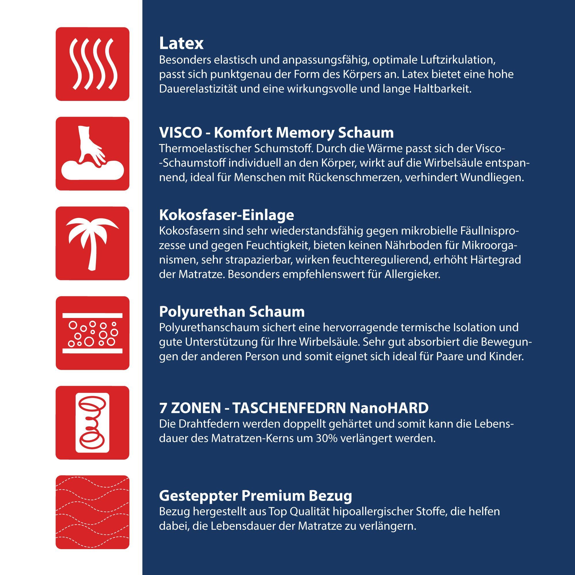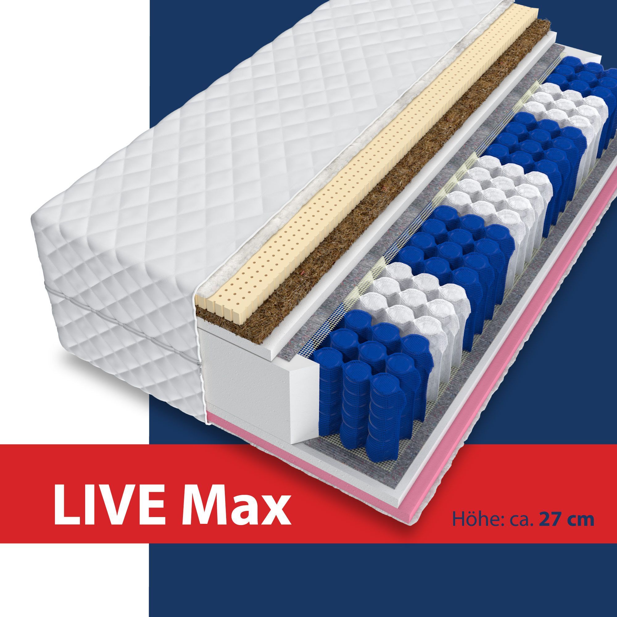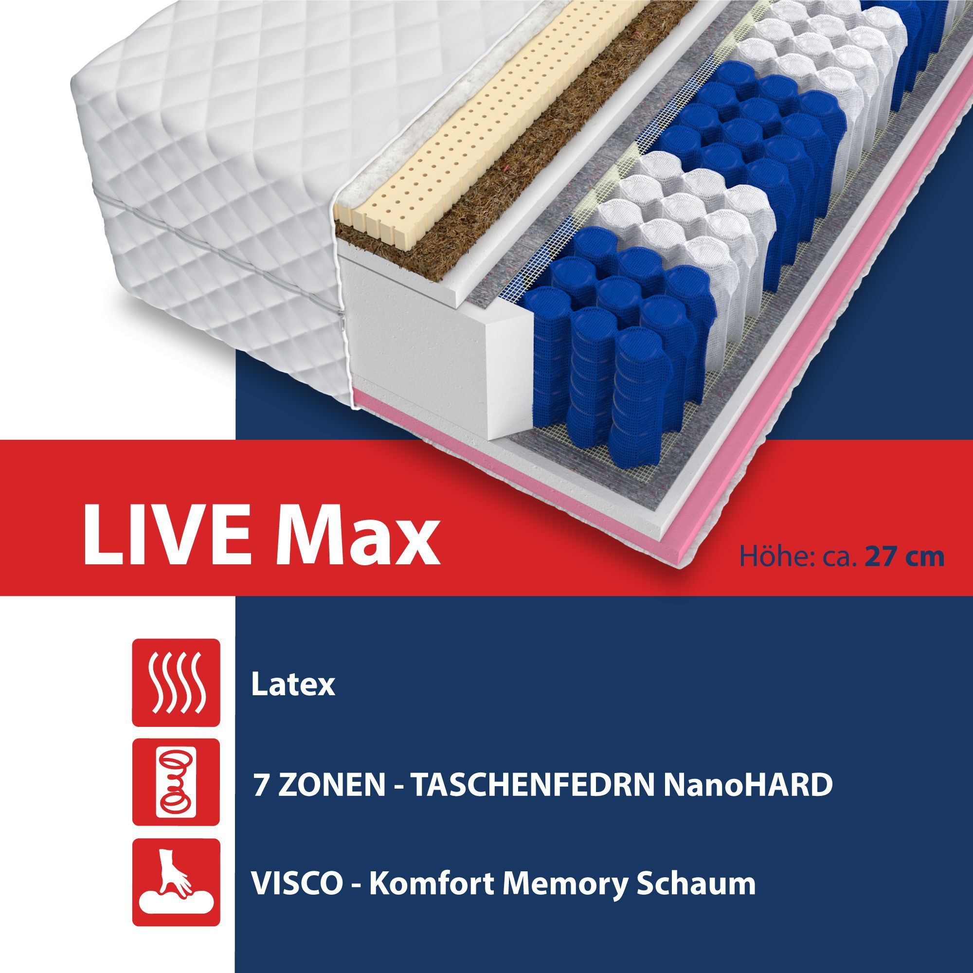Matratze 140x200 LIVE MAX 27cm 7 Zonen Exclusive Taschenfederkern LATEX VISCO H3