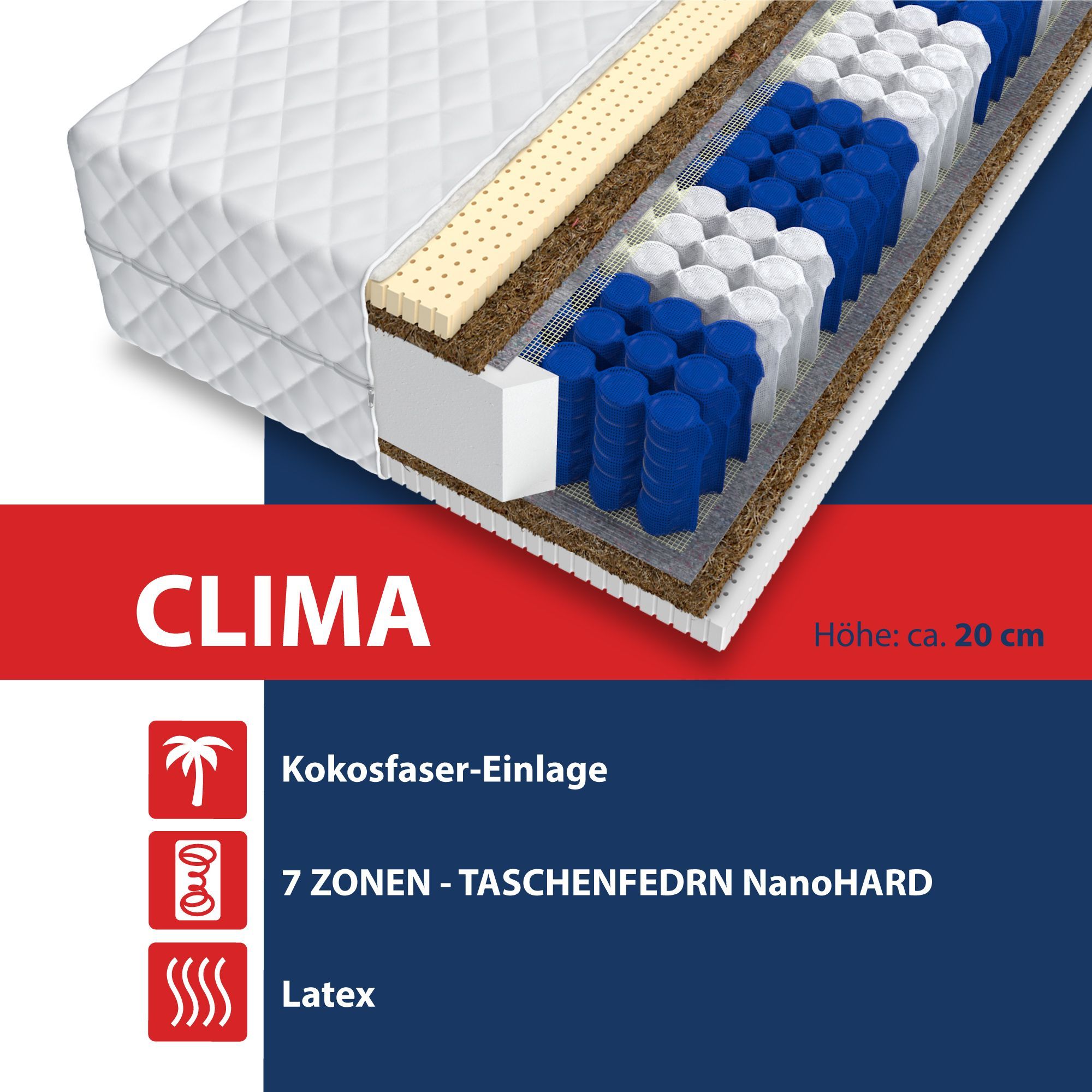 Matratze CLIMA 7 Zonen LATEX Q-GEL KOKOS Taschenfederkern 20 cm H3 Größe wahlbar