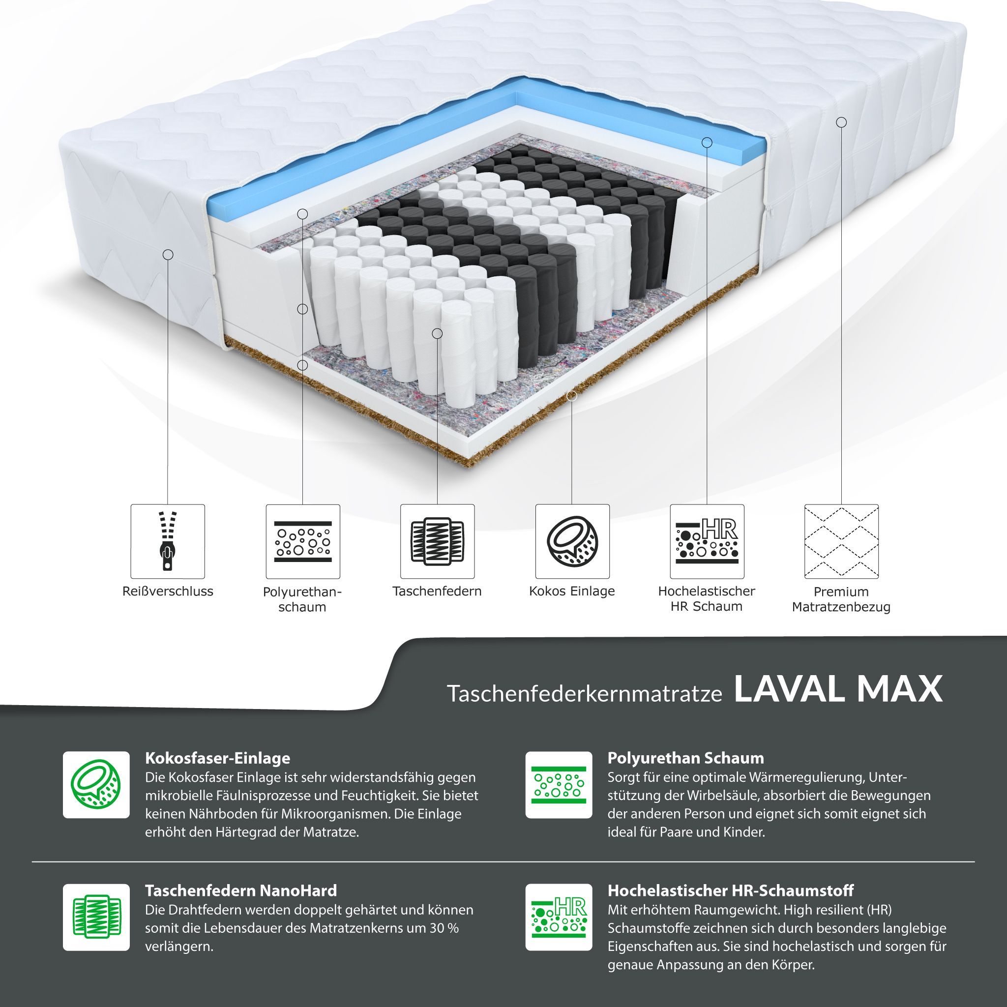 Matratze LAVAL MAX 26 cm 7 Zonen H3 H4 Hybrid FOAM KOKOS Federkern Größe wählbar