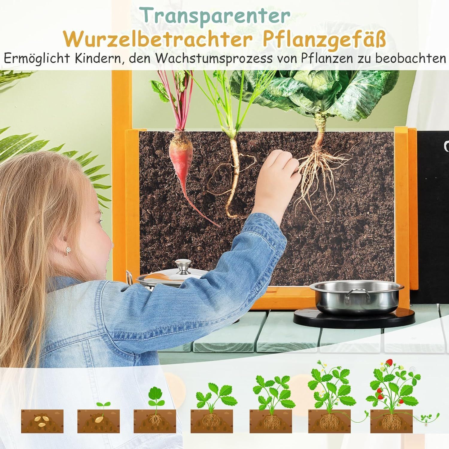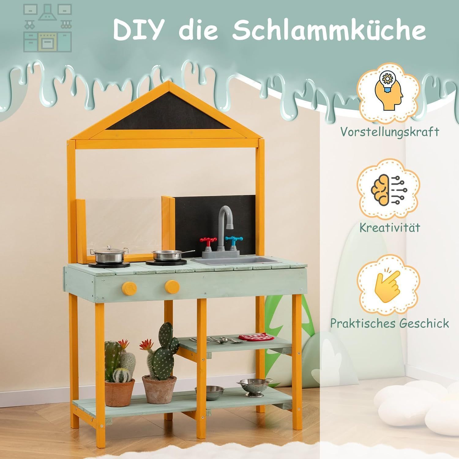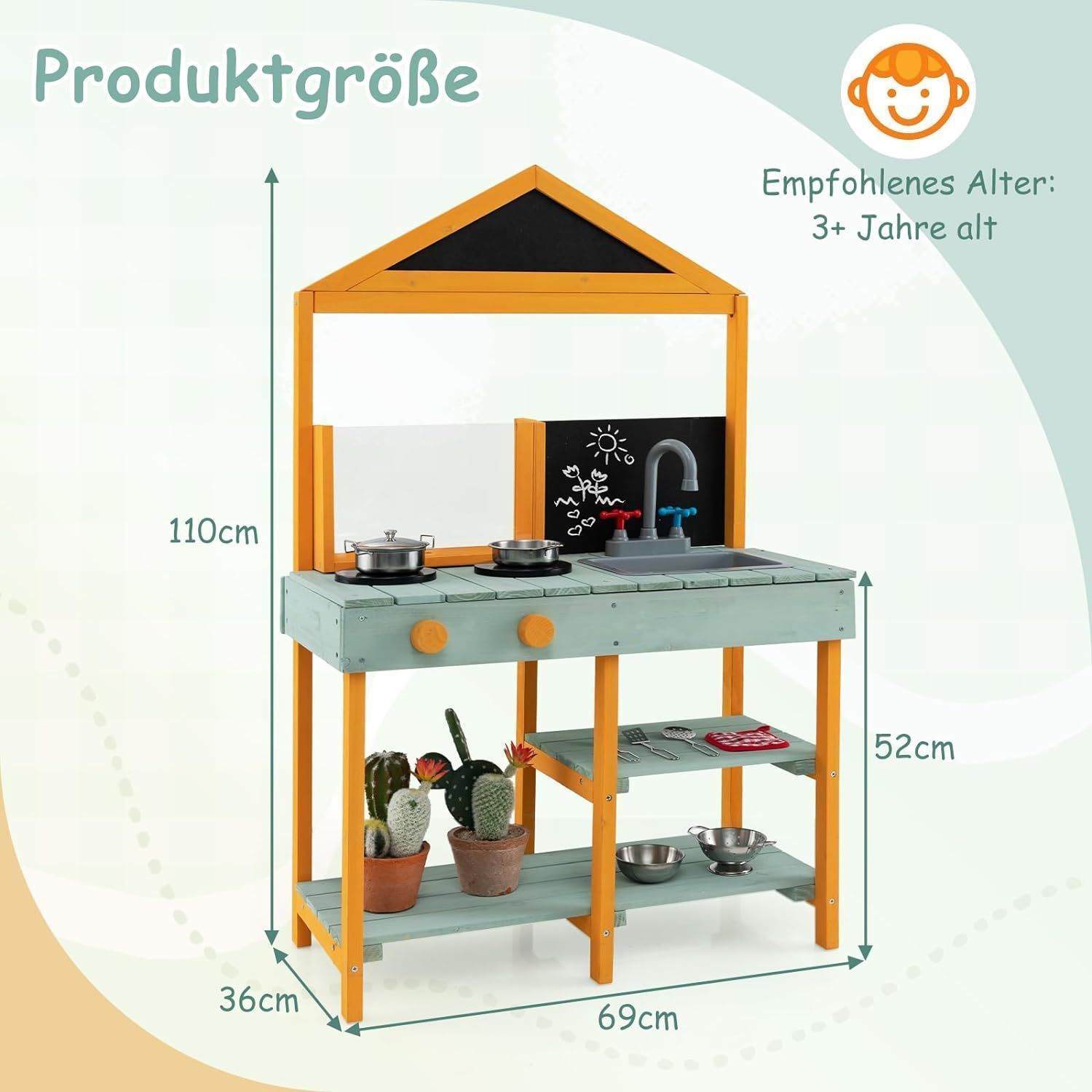 Matschküche Kinder Outdoor, Kinderküche Holz mit Pflanzbehölter & 2 Kreidetafeln