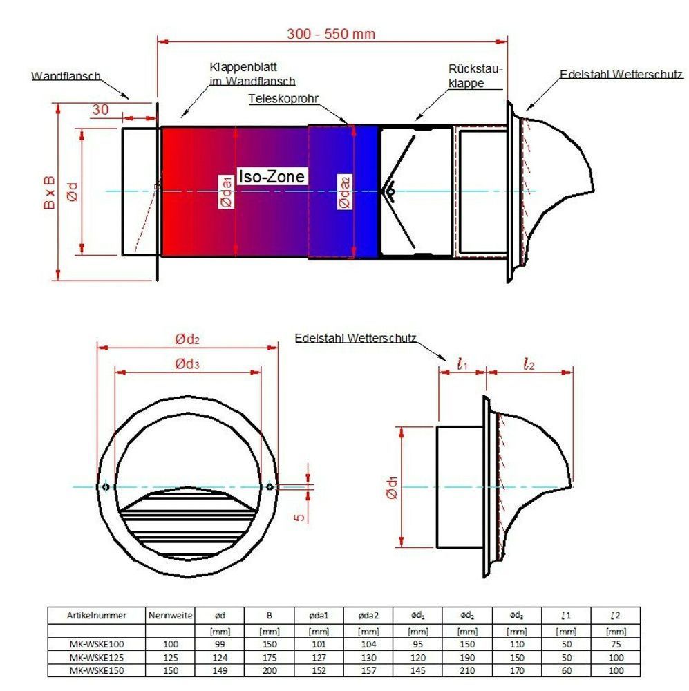 Mauerkasten 100 125 150 Dunstabzug Teleskop Rohr Rückstauklappe Edelstahl MKWSKE