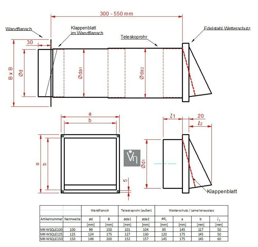 Mauerkasten Ø100 Dunstabzug Teleskop Rohr Edelstahl Ablufthaube MKWSHE100