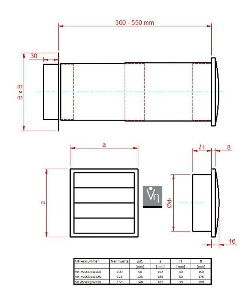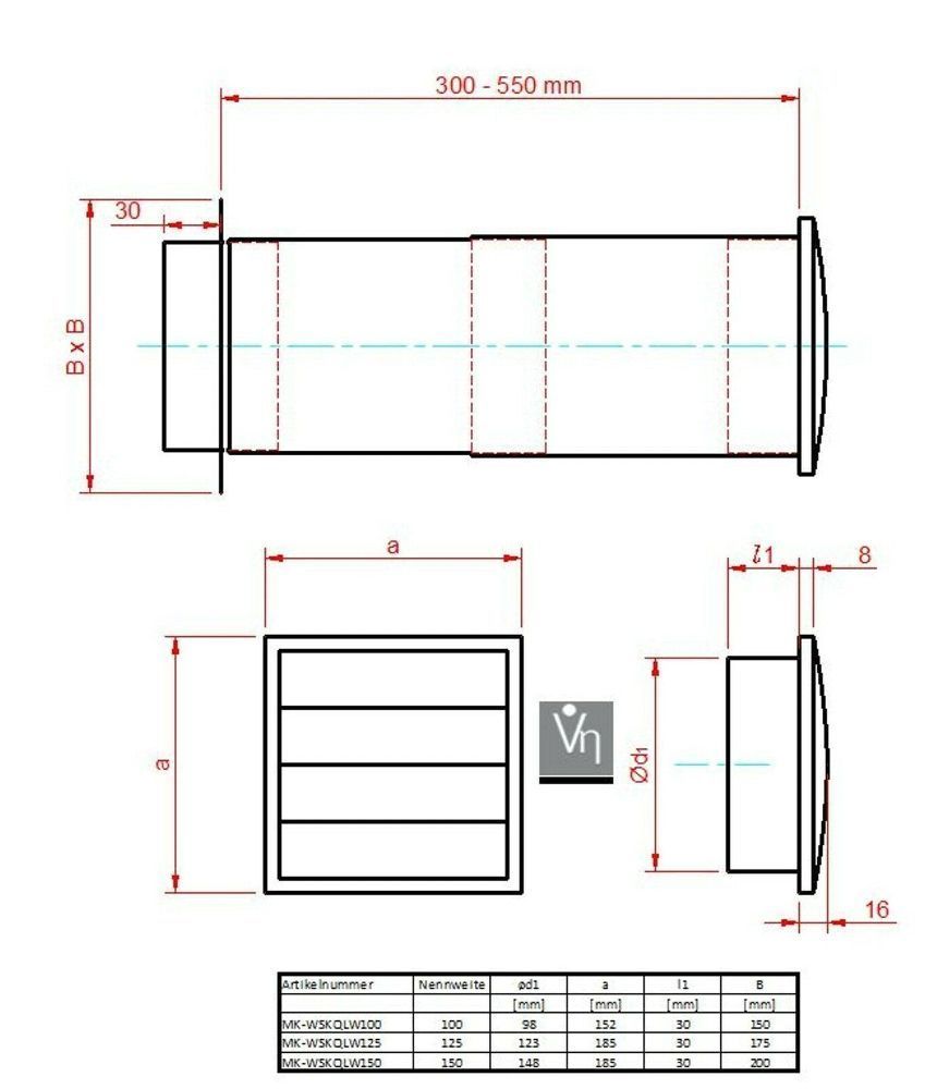 Mauerkasten Ø125 Dunstabzug Teleskop Rohr LamellenVerschlussklappeMKWSKQLW125
