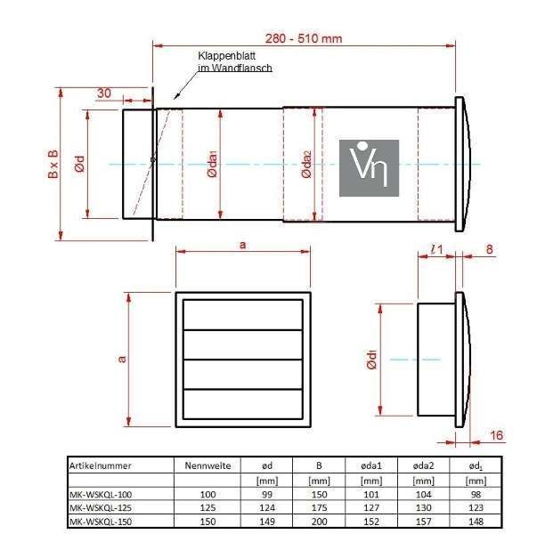 Mauerkasten Ø150 Dunstabzug Teleskop Rohr LamellenVerschlussklappe Mkwskqlb150-2