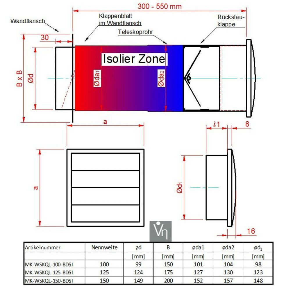 Mauerkasten Ø150 Dunstabzug Teleskop Rohr LamellenVerschlussklappe Mkwskqlw150