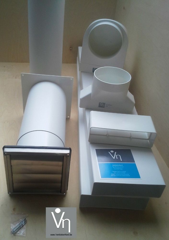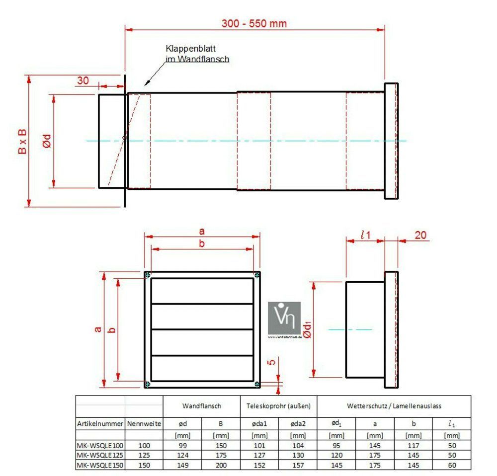Mauerkasten NW 125, Teleskop Rohr mit Edelstahl Wetterschutzgitter und Flachkanal Set bestehend aus: Aufzählung von außen nach innen Wetterschutz WSQLE125 aus Edelstahl mit beweglichen Lamellen Lamellen, diese öffnen wenn die Haube eingeschaltet ist und schließen wenn die Haube abgeschaltet ist. Mit