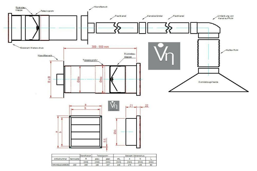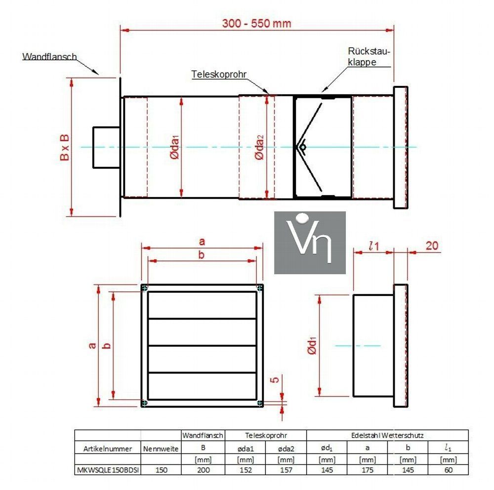 Mauerkasten mit Rückstauklappe, Edelstahl Set Flachkanal 150 S3-K-MKWSQLE150BDSI