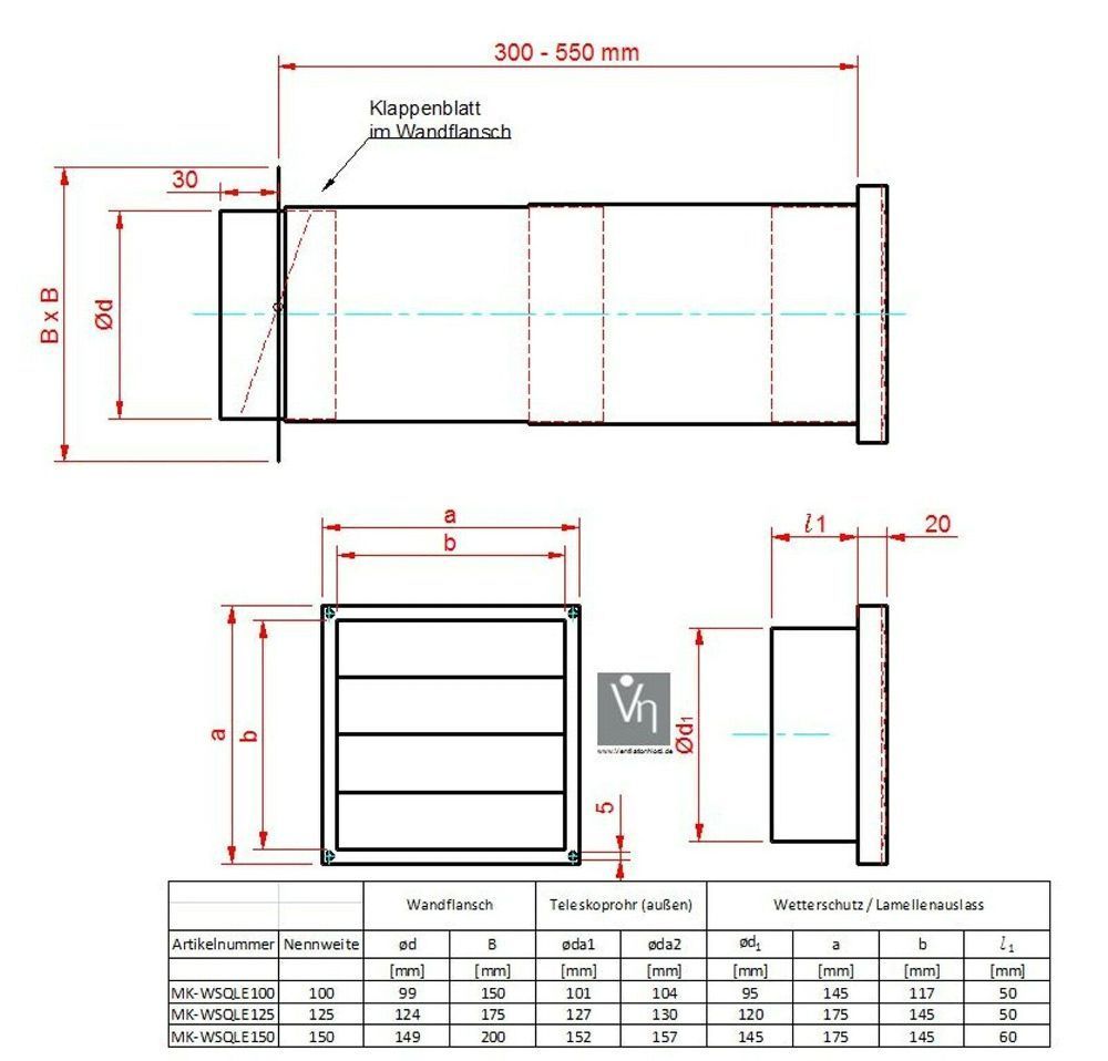 Mauerkasten NW 125 Dunstabzug TeleskopRohrVerschlussklappe Edelstahl Mkwsqle125+