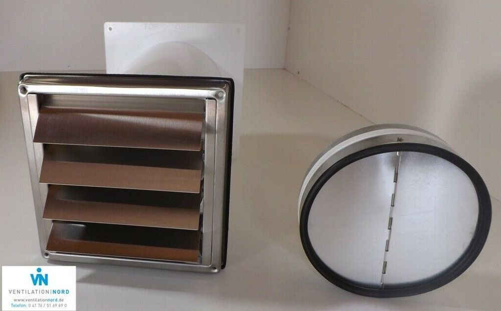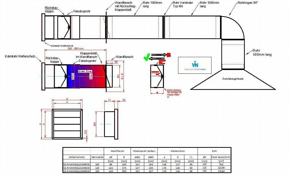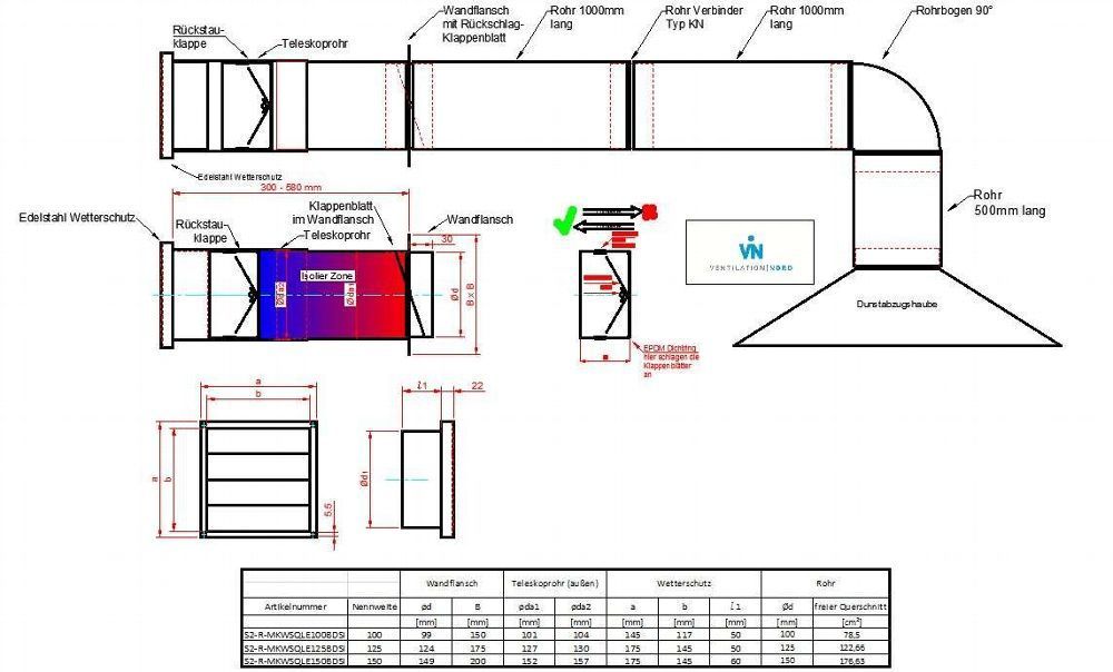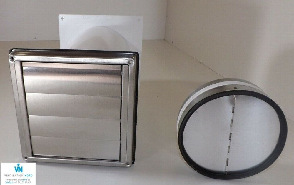 Mauerkasten Set Edelstahl NW125 Dunstabzug Rückstauklappe S2-R-MKWSQLE125BDSI