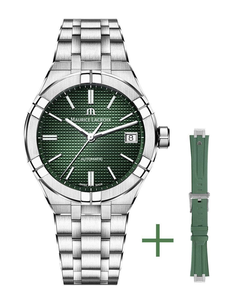 Marke: Maurice Lacroix Referenz: AI6007-SS00F-630-D Geschlecht: Herren Wind: Automatik Zifferblattfarbe: Grüner Sonnenstrahleffekt mit Clous de Paris-Dekorationen Gehäusematerial: Stahl Armbandmaterial: Stahl Produktionsjahr: 2024 Bandfarbe: Grün Verschluss: Doppelt Klappbares Verschlussmaterial: St