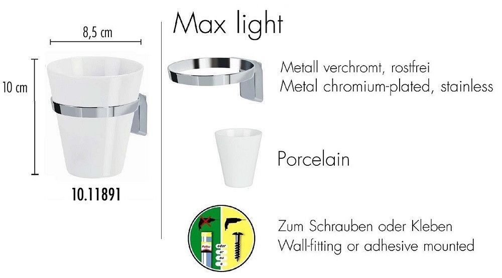 Max Light Chrom Zahnbecher mit Wandhalterung. Metall Verchromt/ Porzellan