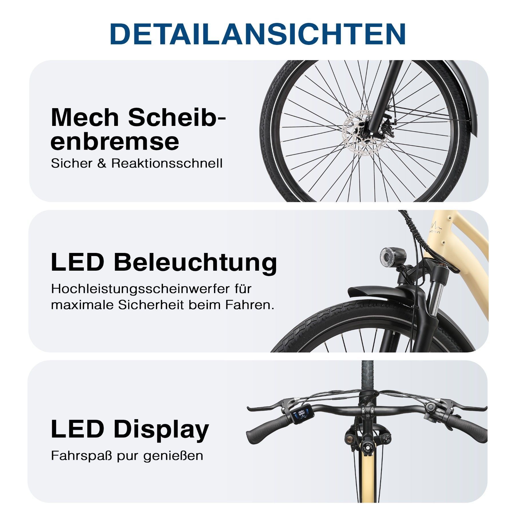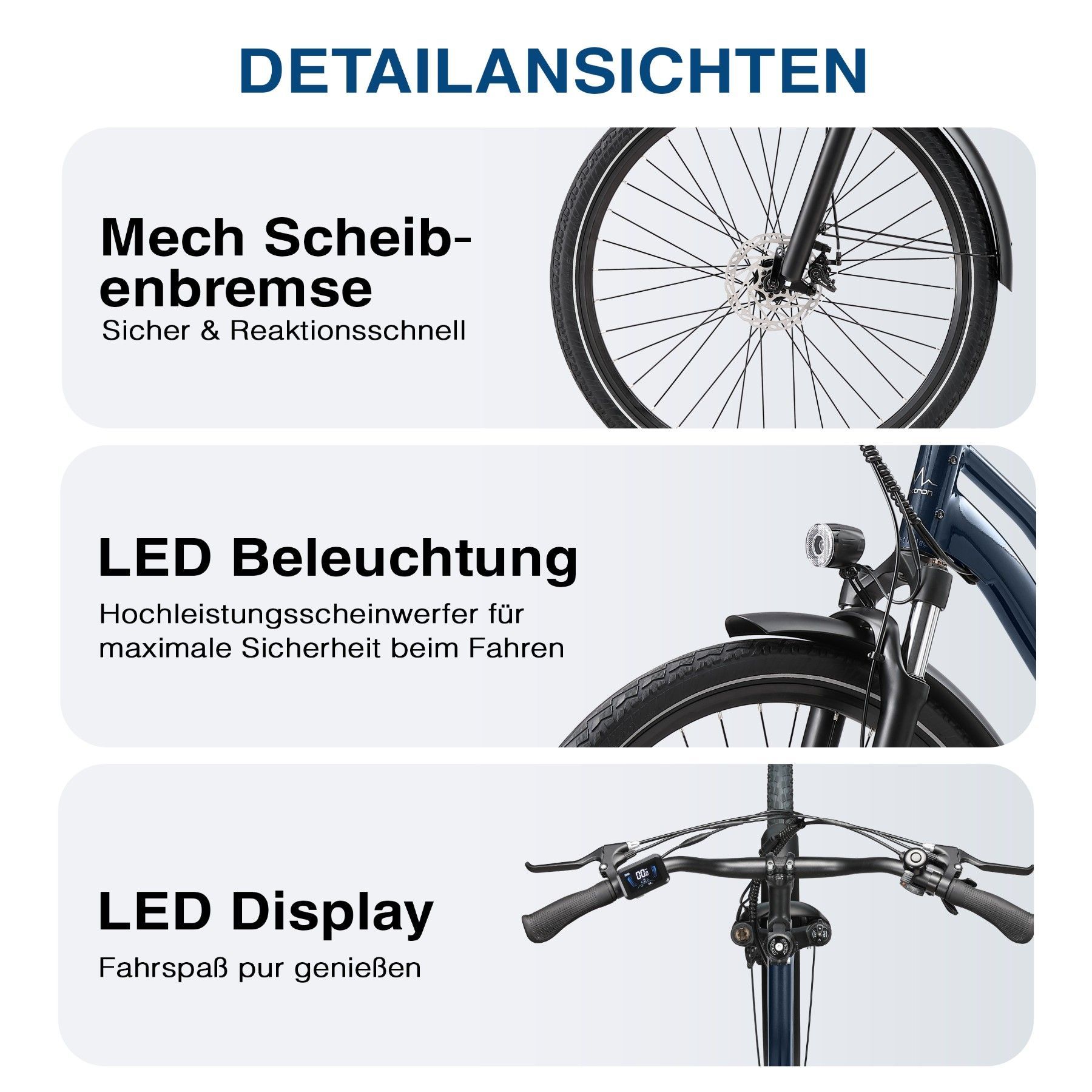 • Bitte lesen Sie vor der ersten Fahrt alle Anweisungen in der Bedienungsanleitung sorgfältig durch. Bevor Sie ein E-Bike kaufen, informieren Sie sich bitte über die örtlichen Verkehrsregeln, ob die Nutzung auf öffentlichen Straßen erlaubt ist, und halten Sie sich an diese. Wir empfehlen das Tragen eines Helms. Stellen Sie sicher, dass das Fahrrad während des Ladevorgangs ausgeschaltet ist und ziehen Sie regelmäßig alle Schrauben fest. Dies erhöht nicht nur die Sicherheit, sondern verlängert auch die Lebensdauer des Fahrrads. Bitte beachten Sie alle geltenden Verkehrsregeln. Von Fahrten bei Rege