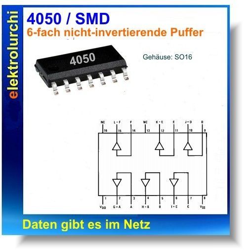 Sie bieten hier auf folgende Artikel NEU 1 Stück MC14050B - 6-fach nicht-invertierende Puffer CMOS IC 4050, SO16, Motorola Der Baustein zählt zu der CMOS 4000 Serie Beschreibung: Der CMOS 4050 enthält 6 nicht invertierende Puffer. Sie können als Pegel-Umsetzer, Stromtreiber oder Verbesserung der Fla