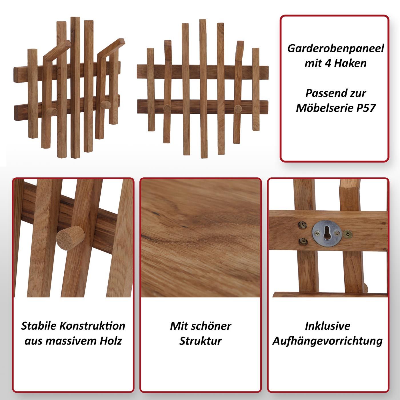 MCA MCA Garderobenpaneel HWC-P57, Wandgarderobe, Massiv-Holz 40x38cm Eiche
