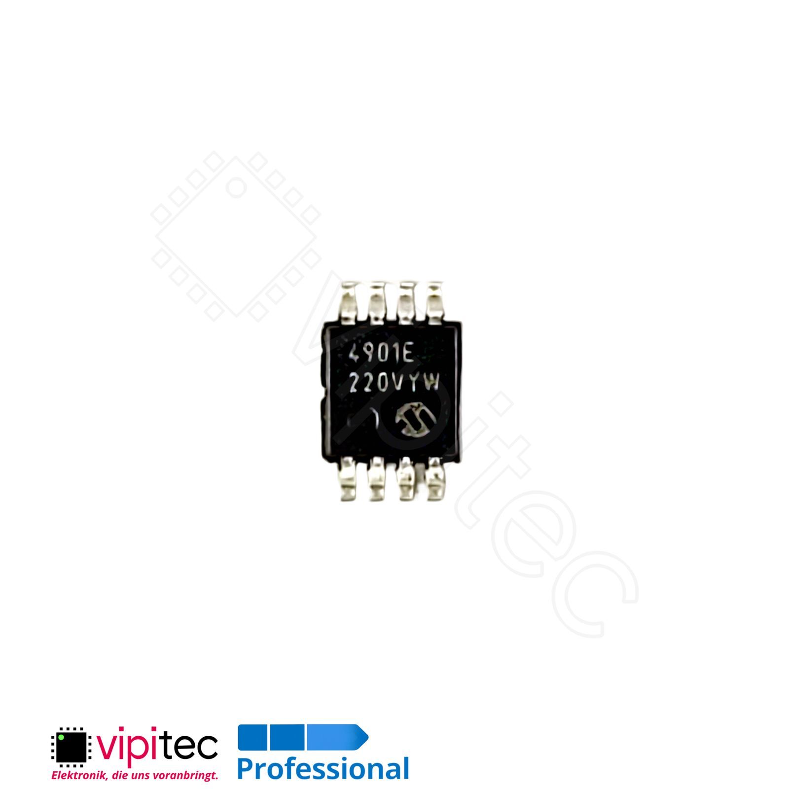 Der MCP4901 ist ein einkanaliger 8-Bit-Digital-Analog-Wandler (DA?Wandler, engl. DAC) im kompakten MSOP?8?Gehäuse zur Oberflächenmontage. Als DA?Wandler übersetzt er digitale Werte in proportionale analoge Spannungen; die 8?Bit?Auflösung entspricht 256 diskreten Ausgangsstufen und erlaubt präzise, aber bewusst grobkörnige Stell- und Referenzsignale, wie sie in Steuer-, Regel- und Interface?Anwendungen üblich sind. Die Ansteuerung erfolgt über ein