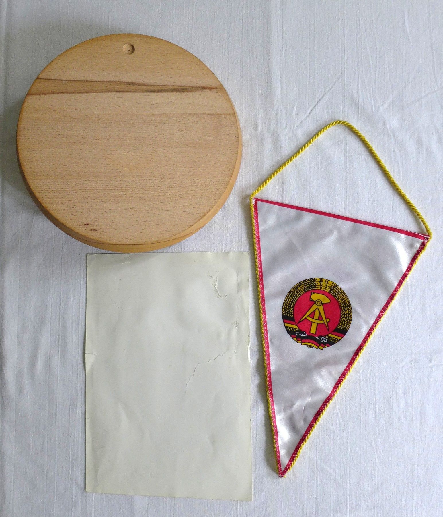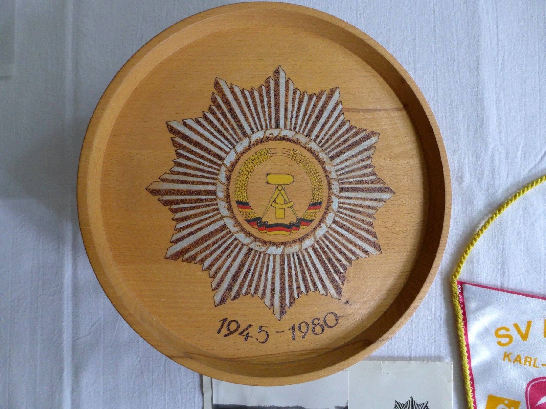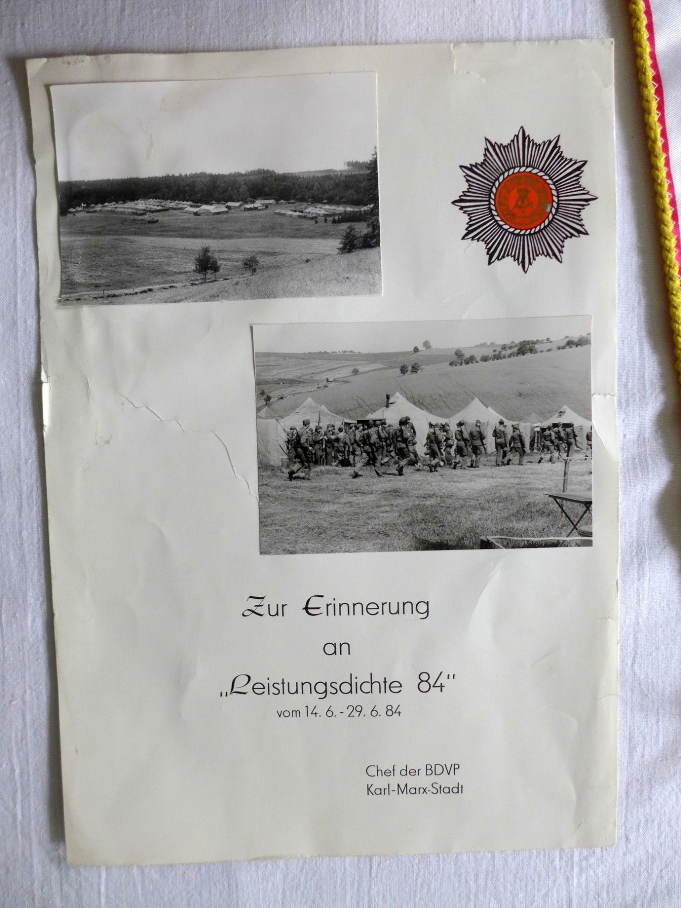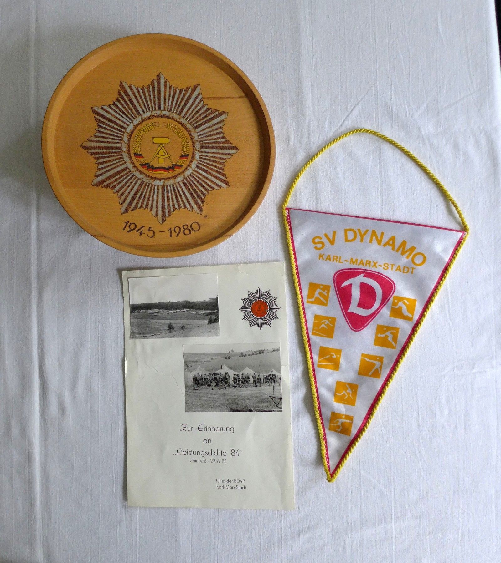 Erinnerungsblatt Übung Leistungsdichte 84 BDVP Karl - Marx - Stadt MdI - gebrauchter Zustand , Gebrauchs - und Lagerspuren siehe Fotos , Holz Teller Durchmesser ca. 27,5 cm , Wimpel Höhe ca. 32 cm ohne Kordel gemessen , Das Erinnerungsblatt mit deutliche Altersspuren siehe Fotos , ADP 95 Der Versand