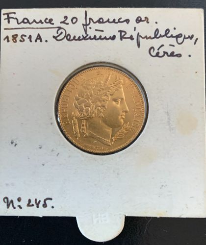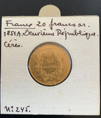 MDS FRANKREICH 20 FRANCS 1851 A CERES , GOLD 1 Prägejahr: 1851 Prägestätte: A - Paris Gold 900 1000 Gewicht: ca. 6,45 g Durchmesser: 21 mm Zustand Erhaltung Details: siehe Fotos Versand nur 1x die Woche immer Samstags.