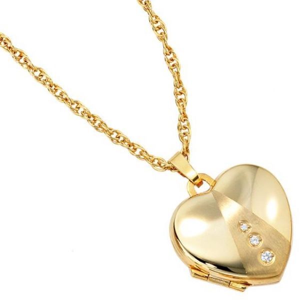 JOBO Medaillon Herz 333 Gelbgold mattiert 3 Zirkonia Anhänger zum Öffnen