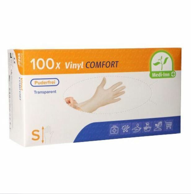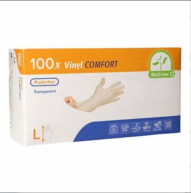Medi-Inn® Handschuhe, Vinyl puderfrei Comfort Produktbeschreibung Einmalhandschuh aus Vinyl - Preisgünstiges Einstiegsmodell - Farbe: Transparent - AQL 1,5 - Medizinische Qualität - Box 100 Stück - Für Reinigung anwendbar Vinylhandschuhe enthalten Weichmacher, diese können durch Kontakt mit fettigen