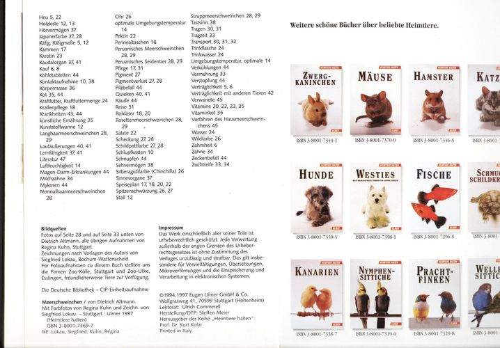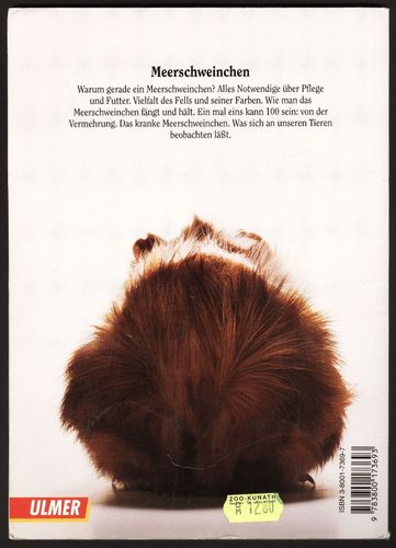 Aus meinem privaten Bücherregal: Meerschweinchen, Reihe Heimtiere halten, Dietrich Altmann, Regina Kuhn, Siegfried Lokau, Ulmer Verlag, 1997, 2. Auflage Paperback, 23 x 16,5cm, 48 Seiten, 162g Erhaltung: Gut, 2, Umschlag etwas knickig und berieben, sonst außen wie innen sauber, Bindung intakt, volls... Mehr