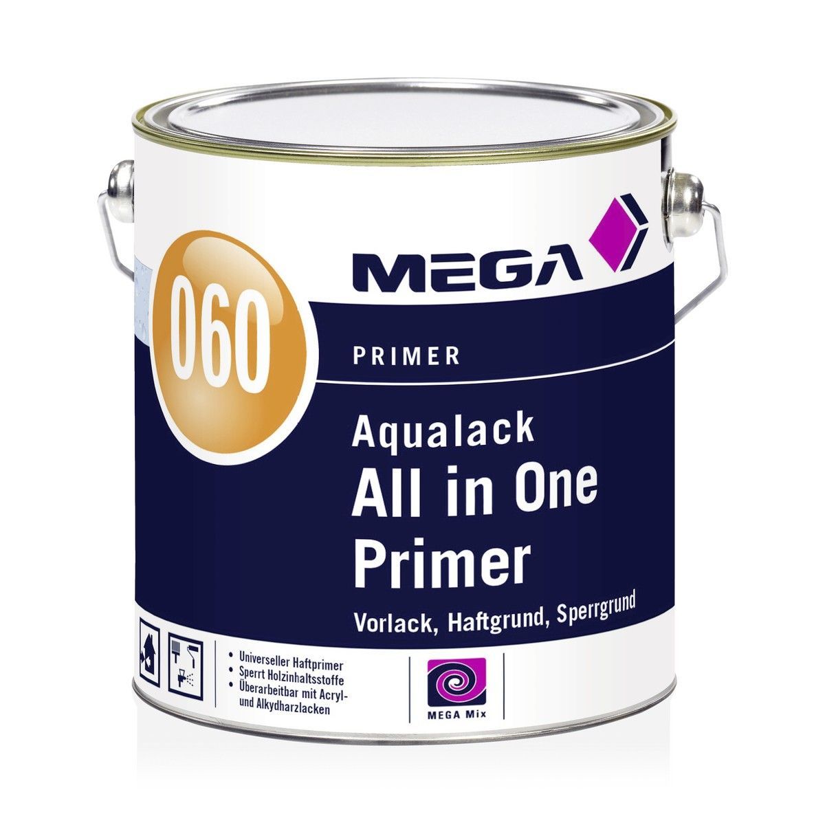 MEGA 060 Aqualack All in One Primer 12,5 Liter weiß Details für 060 Aqualack All in One Primer 12,5 Liter weiß: Hochwertiger wasserbasierter Universal-Primer, anwendbar als wässriger Vorlack, Haftprimer und absperrender Grundanstrich auf Basis einer Kationischen Acrylatdispersion. Dieser Primer sper
